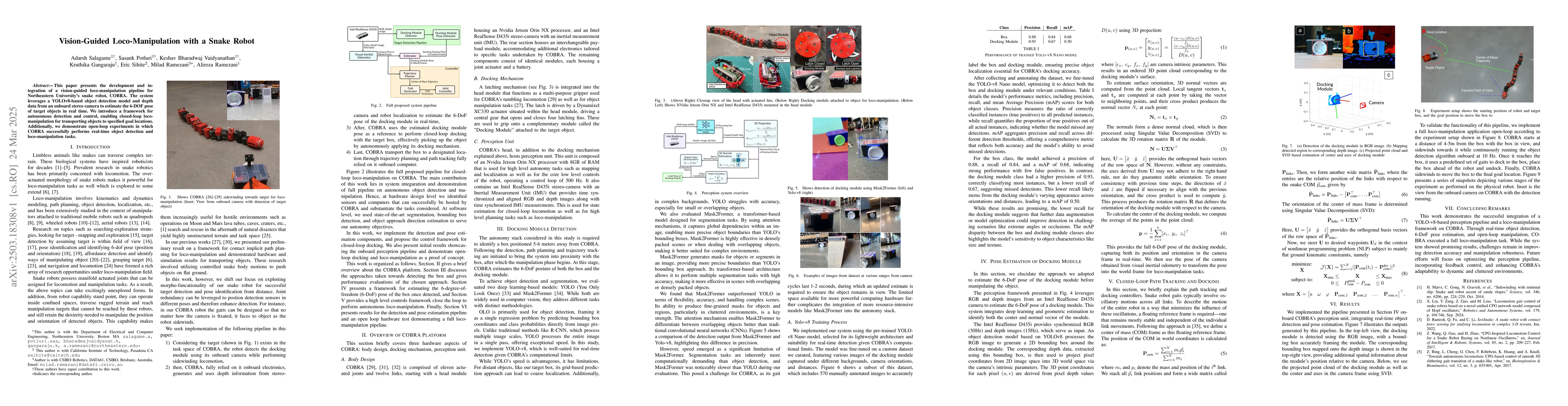 The research presents a vision-guided loco-manipulation pipeline for the snake robot COBRA, integrating a YOLOv8-based object detection model with depth data from an onboard stereo camera for real-time 6-DOF pose estimation of target objects.