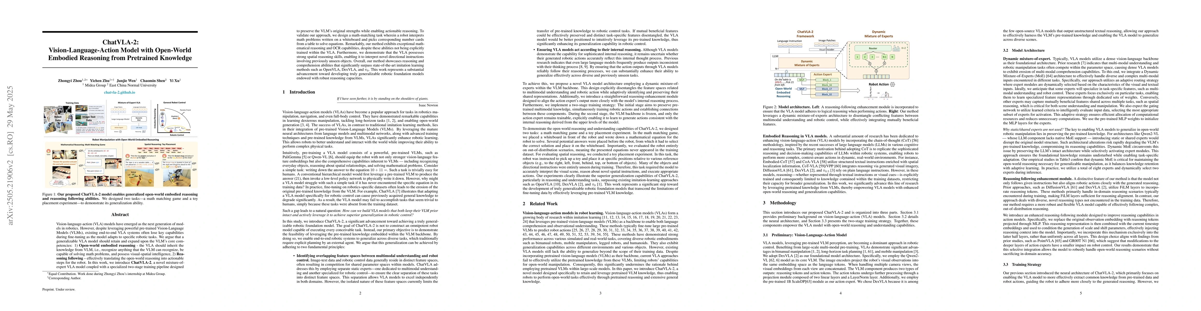 Vision-language-action (VLA) models have emerged as the next generation of models in robotics. However, despite leveraging powerful pre-trained Vision-Language Models (VLMs), existing end-to-end VLA systems often lose key capabilities during fine-tuning as the model adapts to specific robotic tasks. We argue that a generalizable VLA model should retain and expand upon the VLM's core competencies: 1) Open-world embodied reasoning - the VLA should inherit the knowledge from VLM, i.e., recognize anything that the VLM can recognize, capable of solving math problems, possessing visual-spatial intelligence, 2) Reasoning following - effectively translating the open-world reasoning into actionable steps for the robot. In this work, we introduce ChatVLA-2, a novel mixture-of-expert VLA model coupled with a specialized three-stage training pipeline designed to preserve the VLM's original strengths while enabling actionable reasoning. To validate our approach, we design a math-matching task wherein a robot interprets math problems written on a whiteboard and picks corresponding number cards from a table to solve equations. Remarkably, our method exhibits exceptional mathematical reasoning and OCR capabilities, despite these abilities not being explicitly trained within the VLA. Furthermore, we demonstrate that the VLA possesses strong spatial reasoning skills, enabling it to interpret novel directional instructions involving previously unseen objects. Overall, our method showcases reasoning and comprehension abilities that significantly surpass state-of-the-art imitation learning methods such as OpenVLA, DexVLA, and pi-zero. This work represents a substantial advancement toward developing truly generalizable robotic foundation models endowed with robust reasoning capacities.