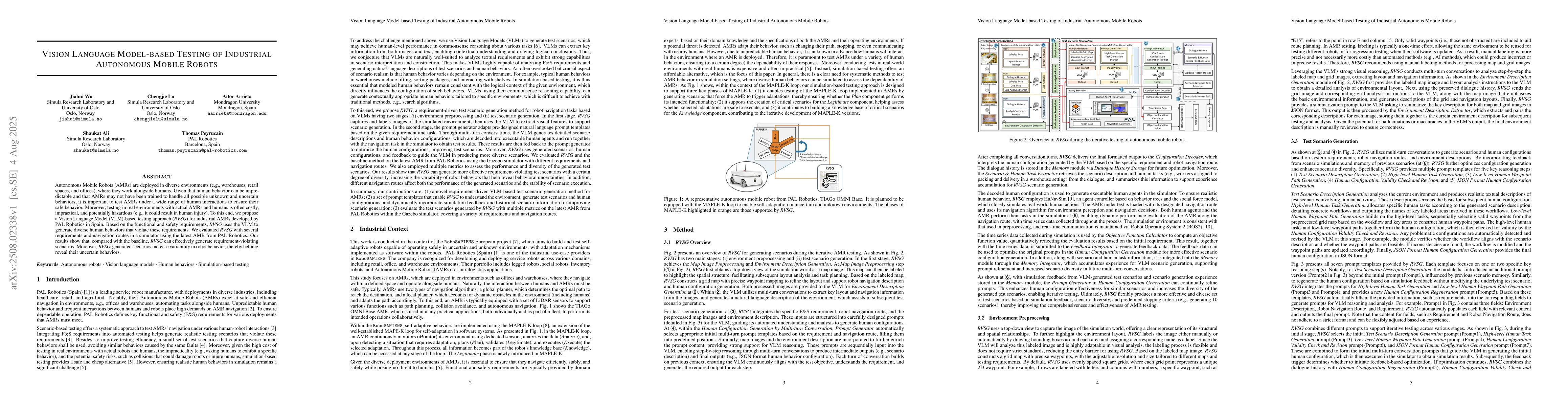 Autonomous Mobile Robots (AMRs) are deployed in diverse environments (e.g., warehouses, retail spaces, and offices), where they work alongside humans. Given that human behavior can be unpredictable and that AMRs may not have been trained to handle all possible unknown and uncertain behaviors, it is important to test AMRs under a wide range of human interactions to ensure their safe behavior. Moreover, testing in real environments with actual AMRs and humans is often costly, impractical, and potentially hazardous (e.g., it could result in human injury). To this end, we propose a Vision Language Model (VLM)-based testing approach (RVSG) for industrial AMRs developed by PAL Robotics in Spain. Based on the functional and safety requirements, RVSG uses the VLM to generate diverse human behaviors that violate these requirements. We evaluated RVSG with several requirements and navigation routes in a simulator using the latest AMR from PAL Robotics. Our results show that, compared with the baseline, RVSG can effectively generate requirement-violating scenarios. Moreover, RVSG-generated scenarios increase variability in robot behavior, thereby helping reveal their uncertain behaviors.
