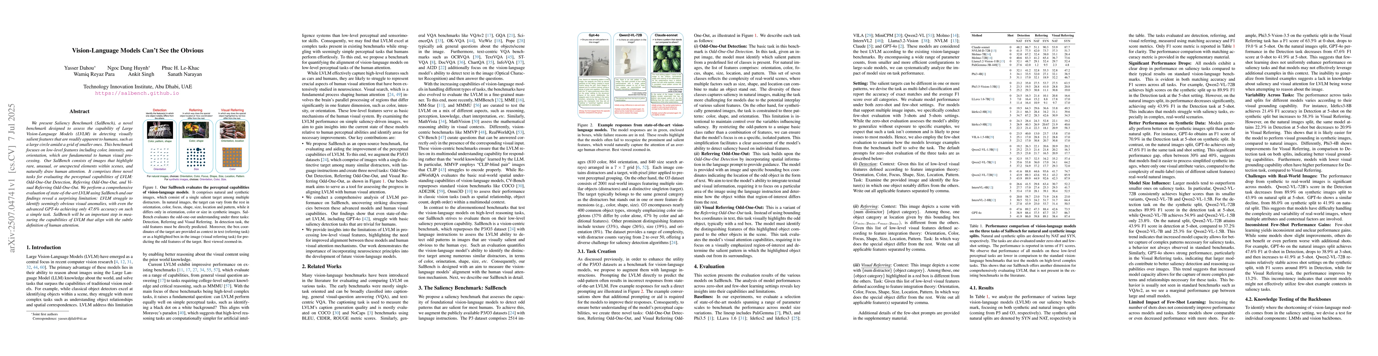 We present Saliency Benchmark (SalBench), a novel benchmark designed to assess the capability of Large Vision-Language Models (LVLM) in detecting visually salient features that are readily apparent to humans, such as a large circle amidst a grid of smaller ones. This benchmark focuses on low-level features including color, intensity, and orientation, which are fundamental to human visual processing. Our SalBench consists of images that highlight rare, unusual, or unexpected elements within scenes, and naturally draw human attention. It comprises three novel tasks for evaluating the perceptual capabilities of LVLM: Odd-One-Out Detection, Referring Odd-One-Out, and Visual Referring Odd-One-Out. We perform a comprehensive evaluation of state-of-the-art LVLM using SalBench and our findings reveal a surprising limitation: LVLM struggle to identify seemingly obvious visual anomalies, with even the advanced GPT-4o achieving only 47.6\% accuracy on such a simple task. SalBench will be an important step in measuring the capabilities of LVLM that align with the subtle definition of human attention.