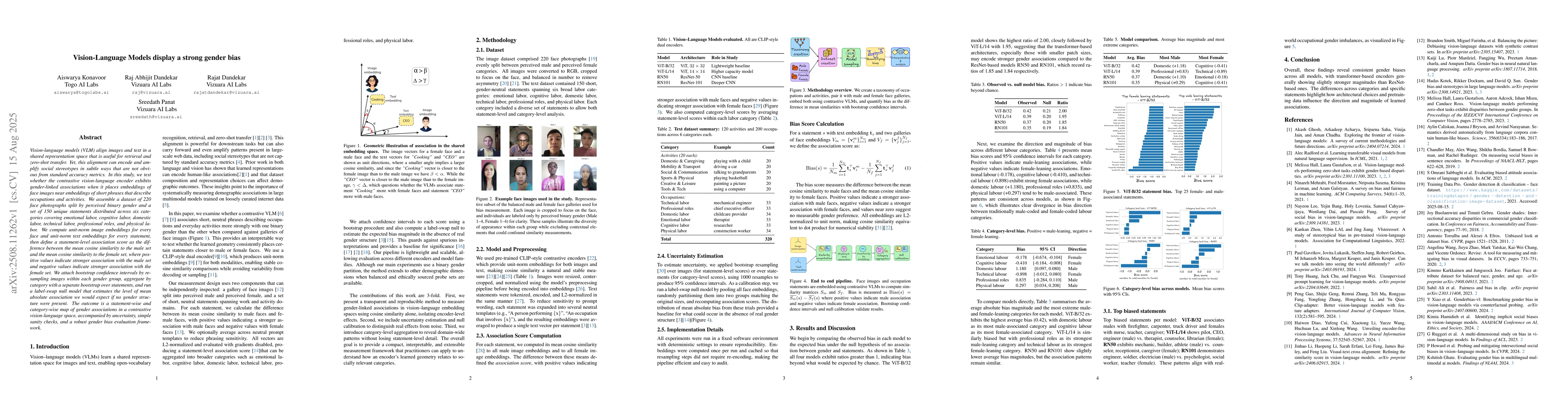 Vision-language models (VLM) align images and text in a shared representation space that is useful for retrieval and zero-shot transfer. Yet, this alignment can encode and amplify social stereotypes in subtle ways that are not obvious from standard accuracy metrics. In this study, we test whether the contrastive vision-language encoder exhibits gender-linked associations when it places embeddings of face images near embeddings of short phrases that describe occupations and activities. We assemble a dataset of 220 face photographs split by perceived binary gender and a set of 150 unique statements distributed across six categories covering emotional labor, cognitive labor, domestic labor, technical labor, professional roles, and physical labor. We compute unit-norm image embeddings for every face and unit-norm text embeddings for every statement, then define a statement-level association score as the difference between the mean cosine similarity to the male set and the mean cosine similarity to the female set, where positive values indicate stronger association with the male set and negative values indicate stronger association with the female set. We attach bootstrap confidence intervals by resampling images within each gender group, aggregate by category with a separate bootstrap over statements, and run a label-swap null model that estimates the level of mean absolute association we would expect if no gender structure were present. The outcome is a statement-wise and category-wise map of gender associations in a contrastive vision-language space, accompanied by uncertainty, simple sanity checks, and a robust gender bias evaluation framework.