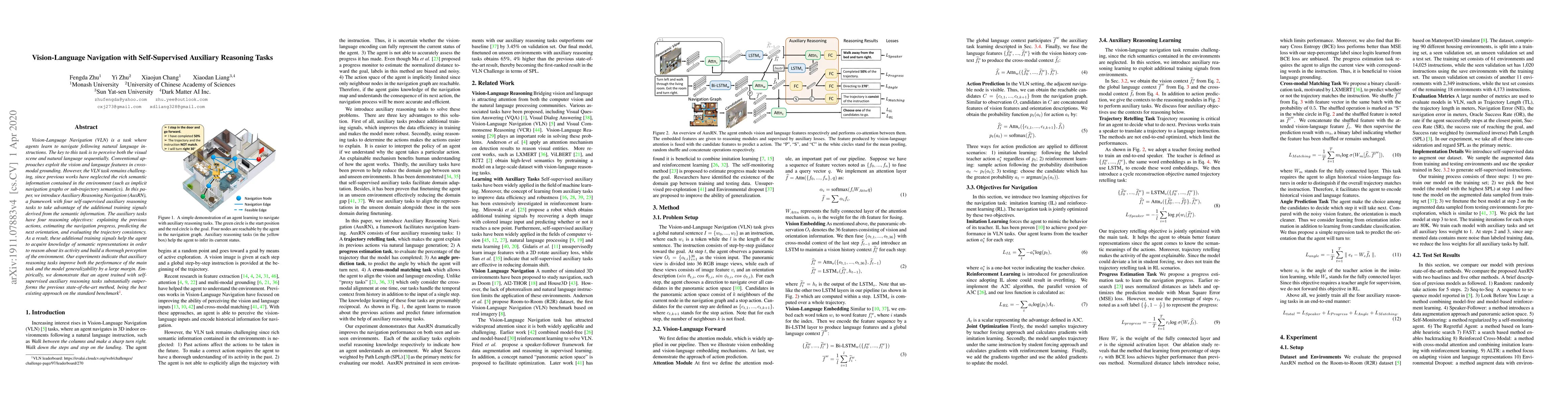This paper introduces Auxiliary Reasoning Navigation (AuxRN), a framework that employs self-supervised auxiliary reasoning tasks to enhance Vision-Language Navigation (VLN) by leveraging semantic information from the environment. The auxiliary tasks improve the agent's performance and generalizability, outperforming previous methods on standard benchmarks.