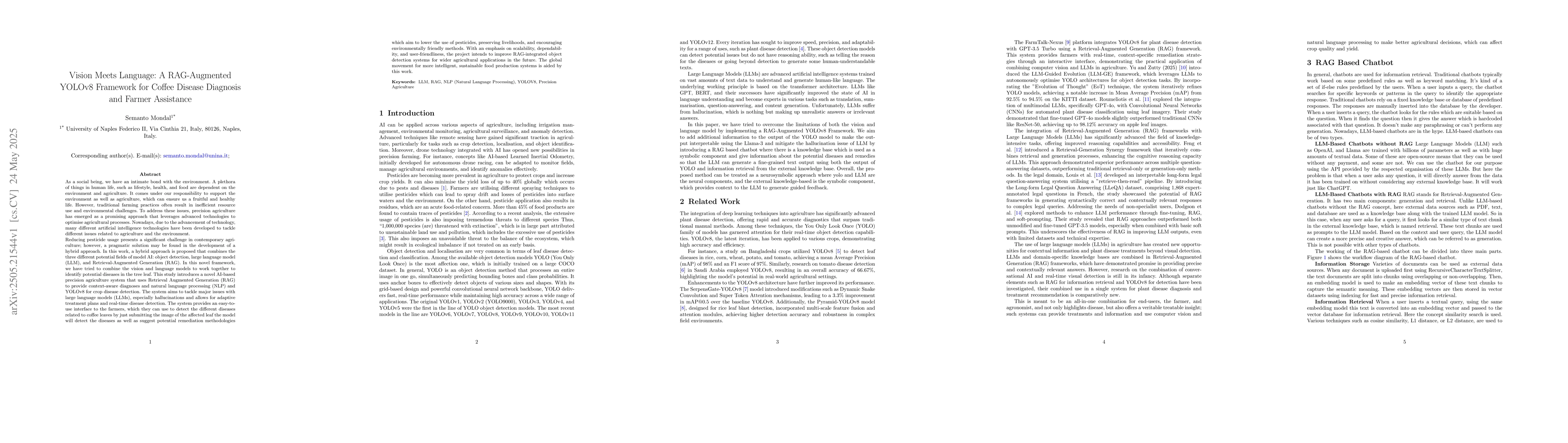 As a social being, we have an intimate bond with the environment. A plethora of things in human life, such as lifestyle, health, and food are dependent on the environment and agriculture. It comes under our responsibility to support the environment as well as agriculture. However, traditional farming practices often result in inefficient resource use and environmental challenges. To address these issues, precision agriculture has emerged as a promising approach that leverages advanced technologies to optimise agricultural processes. In this work, a hybrid approach is proposed that combines the three different potential fields of model AI: object detection, large language model (LLM), and Retrieval-Augmented Generation (RAG). In this novel framework, we have tried to combine the vision and language models to work together to identify potential diseases in the tree leaf. This study introduces a novel AI-based precision agriculture system that uses Retrieval Augmented Generation (RAG) to provide context-aware diagnoses and natural language processing (NLP) and YOLOv8 for crop disease detection. The system aims to tackle major issues with large language models (LLMs), especially hallucinations and allows for adaptive treatment plans and real-time disease detection. The system provides an easy-to-use interface to the farmers, which they can use to detect the different diseases related to coffee leaves by just submitting the image of the affected leaf the model will detect the diseases as well as suggest potential remediation methodologies which aim to lower the use of pesticides, preserving livelihoods, and encouraging environmentally friendly methods. With an emphasis on scalability, dependability, and user-friendliness, the project intends to improve RAG-integrated object detection systems for wider agricultural applications in the future.