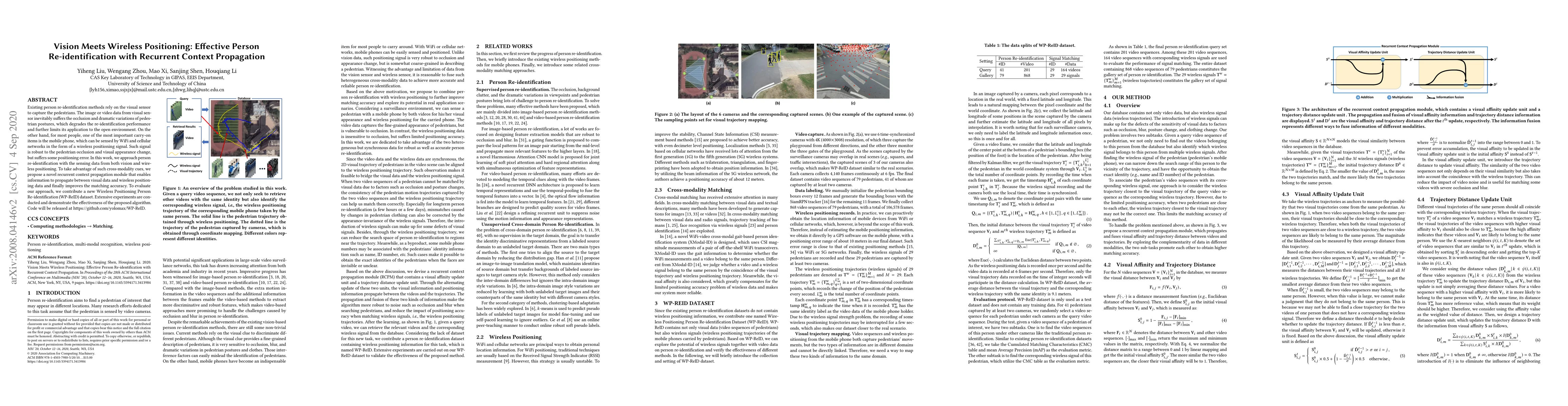This paper proposes a method for person re-identification using both visual and wireless positioning data, leveraging a recurrent context propagation module to enhance matching accuracy despite occlusions and posture variations. A new WP-ReID dataset is introduced, and experiments show improved performance over existing methods.