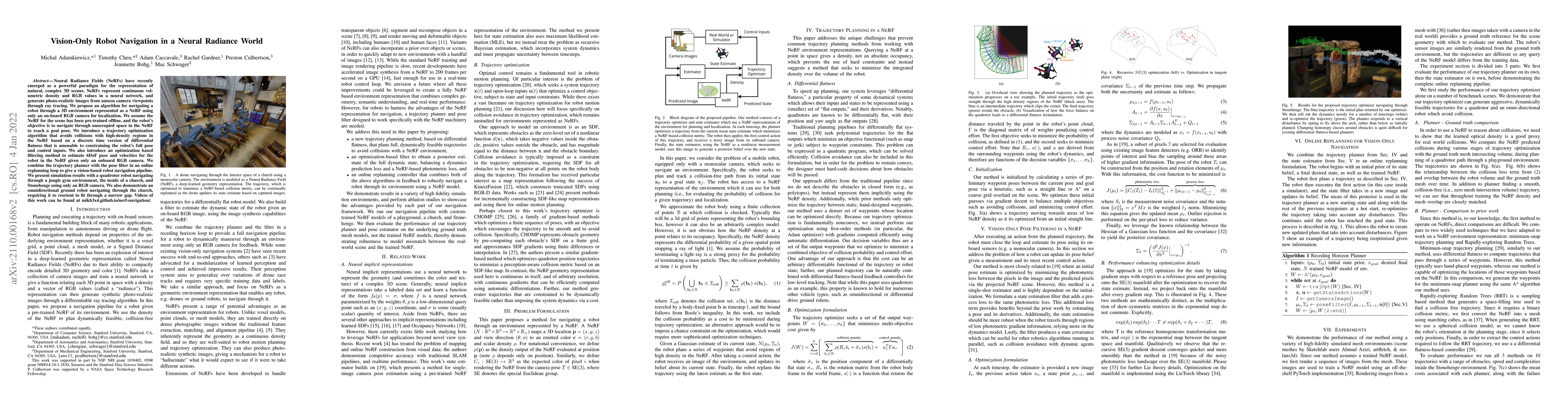 The work is novel in its application of NeRFs for robot navigation, combining them with differential flatness-based planning and a vision-only pose estimation filter, enabling collision-free navigation using only onboard visual sensors.