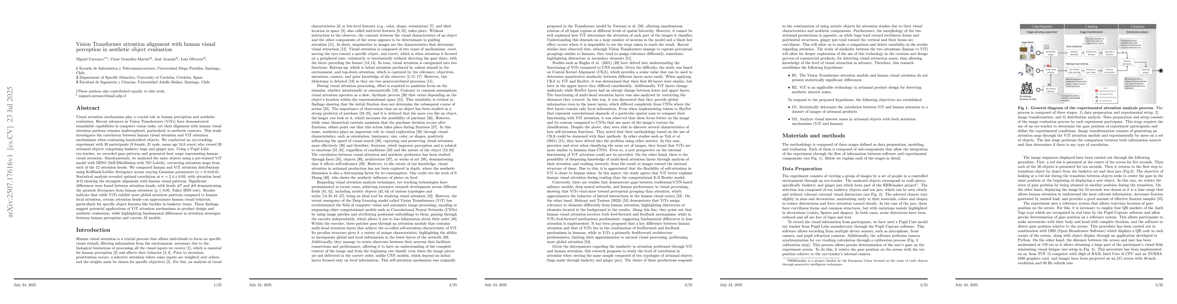 Visual attention mechanisms play a crucial role in human perception and aesthetic evaluation. Recent advances in Vision Transformers (ViTs) have demonstrated remarkable capabilities in computer vision tasks, yet their alignment with human visual attention patterns remains underexplored, particularly in aesthetic contexts. This study investigates the correlation between human visual attention and ViT attention mechanisms when evaluating handcrafted objects. We conducted an eye-tracking experiment with 30 participants (9 female, 21 male, mean age 24.6 years) who viewed 20 artisanal objects comprising basketry bags and ginger jars. Using a Pupil Labs eye-tracker, we recorded gaze patterns and generated heat maps representing human visual attention. Simultaneously, we analyzed the same objects using a pre-trained ViT model with DINO (Self-DIstillation with NO Labels), extracting attention maps from each of the 12 attention heads. We compared human and ViT attention distributions using Kullback-Leibler divergence across varying Gaussian parameters (sigma=0.1 to 3.0). Statistical analysis revealed optimal correlation at sigma=2.4 +-0.03, with attention head #12 showing the strongest alignment with human visual patterns. Significant differences were found between attention heads, with heads #7 and #9 demonstrating the greatest divergence from human attention (p< 0.05, Tukey HSD test). Results indicate that while ViTs exhibit more global attention patterns compared to human focal attention, certain attention heads can approximate human visual behavior, particularly for specific object features like buckles in basketry items. These findings suggest potential applications of ViT attention mechanisms in product design and aesthetic evaluation, while highlighting fundamental differences in attention strategies between human perception and current AI models.