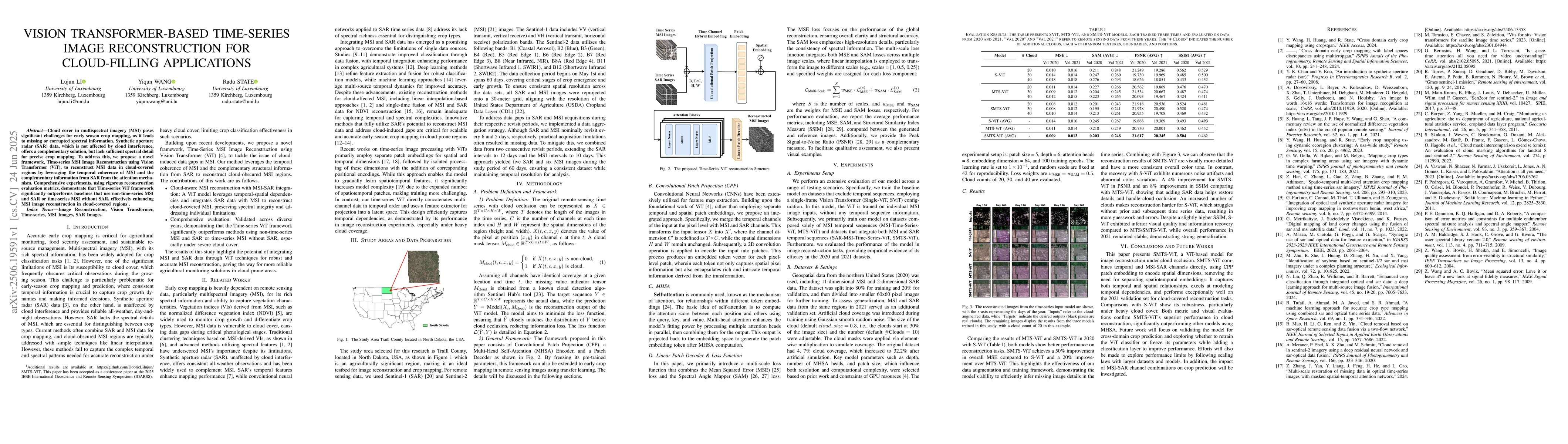 Cloud cover in multispectral imagery (MSI) poses significant challenges for early season crop mapping, as it leads to missing or corrupted spectral information. Synthetic aperture radar (SAR) data, which is not affected by cloud interference, offers a complementary solution, but lack sufficient spectral detail for precise crop mapping. To address this, we propose a novel framework, Time-series MSI Image Reconstruction using Vision Transformer (ViT), to reconstruct MSI data in cloud-covered regions by leveraging the temporal coherence of MSI and the complementary information from SAR from the attention mechanism. Comprehensive experiments, using rigorous reconstruction evaluation metrics, demonstrate that Time-series ViT framework significantly outperforms baselines that use non-time-series MSI and SAR or time-series MSI without SAR, effectively enhancing MSI image reconstruction in cloud-covered regions.