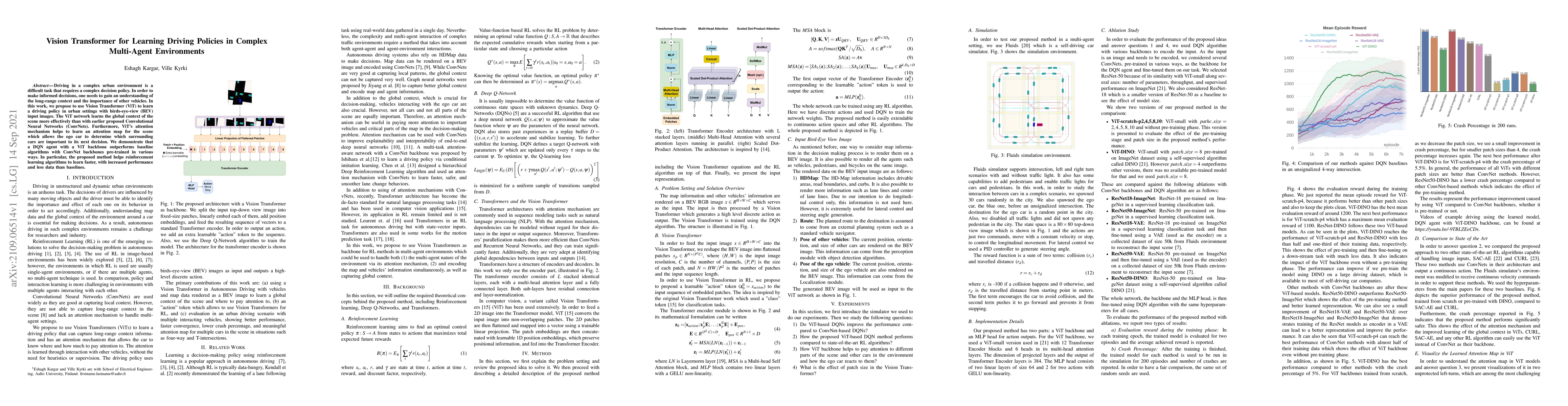 A Vision Transformer (ViT) algorithm is proposed to learn driving policies in complex urban environments, outperforming baseline algorithms with Convolutional Neural Networks.