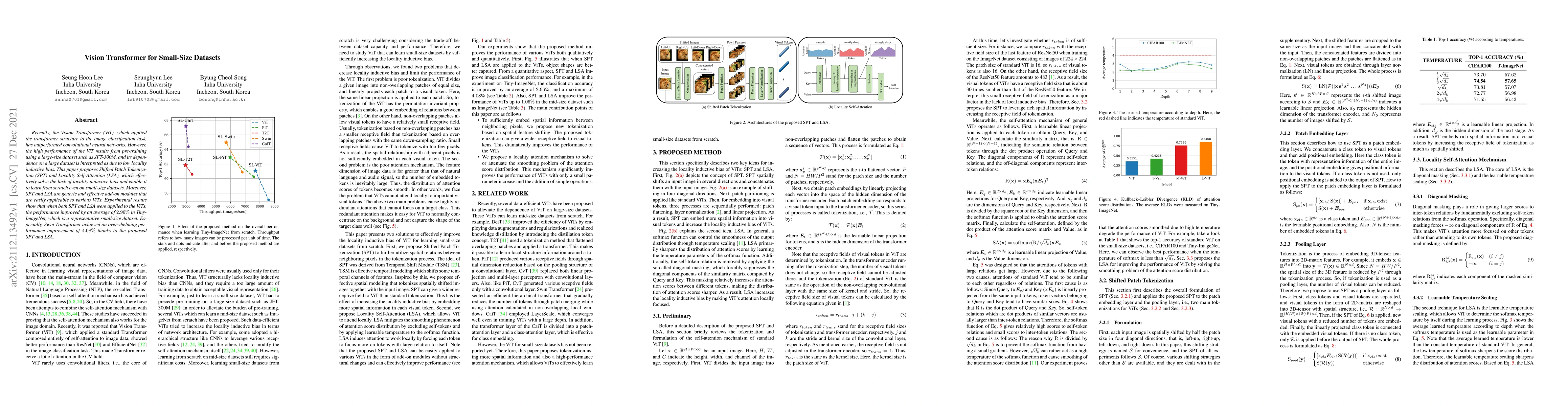 This paper proposes Shifted Patch Tokenization (SPT) and Locality Self-Attention (LSA) to enhance Vision Transformers (ViT) for small-size datasets, achieving a 2.96% average performance improvement in Tiny-ImageNet. Swin Transformer notably improved by 4.08% with these methods.