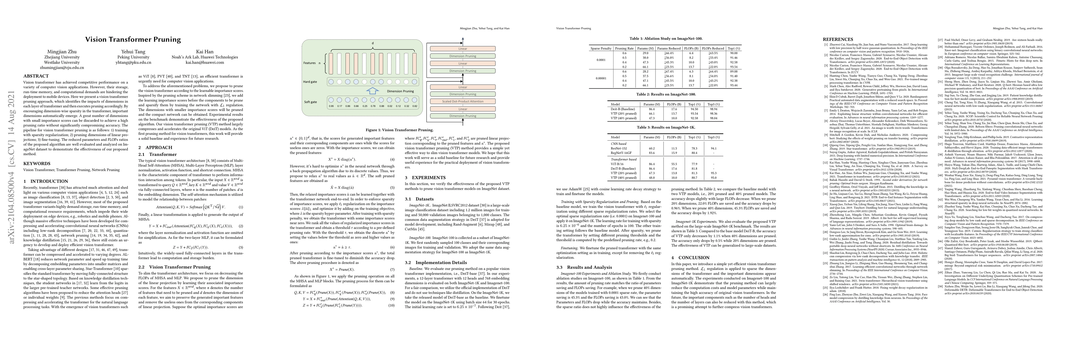 This paper proposes a vision transformer pruning method to reduce storage and computational demands, focusing on identifying and discarding less important dimensions through sparsity regularization, dimension-wise pruning, and fine-tuning. The approach achieves high pruning ratios with minimal loss of accuracy, demonstrated on the ImageNet dataset.