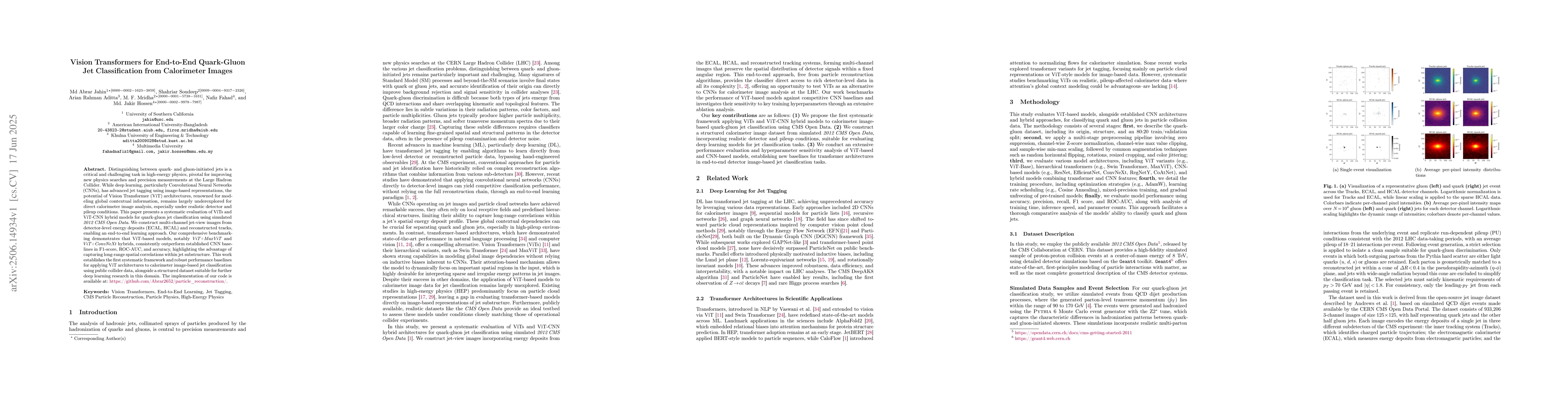 Distinguishing between quark- and gluon-initiated jets is a critical and challenging task in high-energy physics, pivotal for improving new physics searches and precision measurements at the Large Hadron Collider. While deep learning, particularly Convolutional Neural Networks (CNNs), has advanced jet tagging using image-based representations, the potential of Vision Transformer (ViT) architectures, renowned for modeling global contextual information, remains largely underexplored for direct calorimeter image analysis, especially under realistic detector and pileup conditions. This paper presents a systematic evaluation of ViTs and ViT-CNN hybrid models for quark-gluon jet classification using simulated 2012 CMS Open Data. We construct multi-channel jet-view images from detector-level energy deposits (ECAL, HCAL) and reconstructed tracks, enabling an end-to-end learning approach. Our comprehensive benchmarking demonstrates that ViT-based models, notably ViT+MaxViT and ViT+ConvNeXt hybrids, consistently outperform established CNN baselines in F1-score, ROC-AUC, and accuracy, highlighting the advantage of capturing long-range spatial correlations within jet substructure. This work establishes the first systematic framework and robust performance baselines for applying ViT architectures to calorimeter image-based jet classification using public collider data, alongside a structured dataset suitable for further deep learning research in this domain.