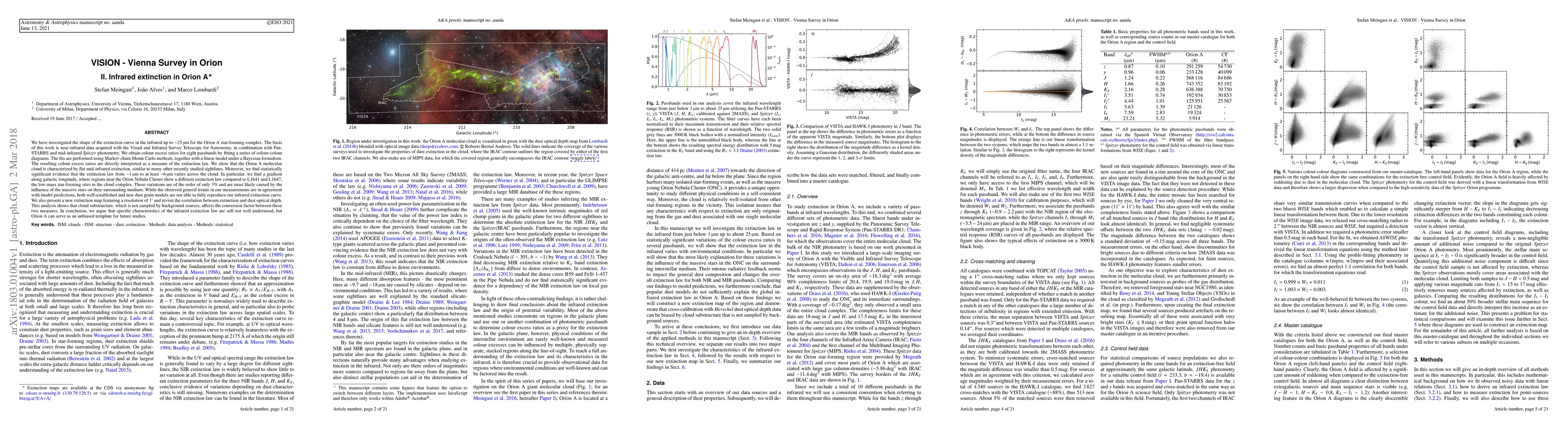 We have investigated the shape of the extinction curve in the infrared up to ~25 {\mu}m for the Orion A star-forming complex. The basis of this work is near-infrared data acquired with VISTA, in combination with Pan-STARRS and mid-infrared Spitzer photometry. We obtain colour excess ratios for eight passbands by fitting a series of colour-colour diagrams. The fits are performed using Markov chain Monte Carlo methods, together with a linear model under a Bayesian formalism. The resulting colour excess ratios are directly interpreted as a measure of the extinction law. We show that the Orion A molecular cloud is characterized by flat mid-infrared extinction, similar to many other recently studied sightlines. Moreover, we find statistically significant evidence that the extinction law from ~1 {\mu}m to at least ~6 {\mu}m varies across the cloud. In particular, we find a gradient along galactic longitude, where regions near the ONC show a different extinction law compared to L1641 and L1647, the low-mass star-forming sites in the cloud complex. These variations are of the order of only 3% and are most likely caused by the influence of the massive stars on their surrounding medium. While the observed general trends in our measurements are in agreement with model predictions, both well-established and new dust grain models are not able to fully reproduce our infrared extinction curve. We also present a new extinction map featuring a resolution of 1 arcmin and revisit the correlation between extinction and dust optical depth. This analysis shows that cloud substructure, which is not sampled by background sources, affects the conversion factor between these two measures. In conclusion, we argue that specific characteristics of the infrared extinction law are still not well understood, but Orion A can serve as an unbiased template for future studies.