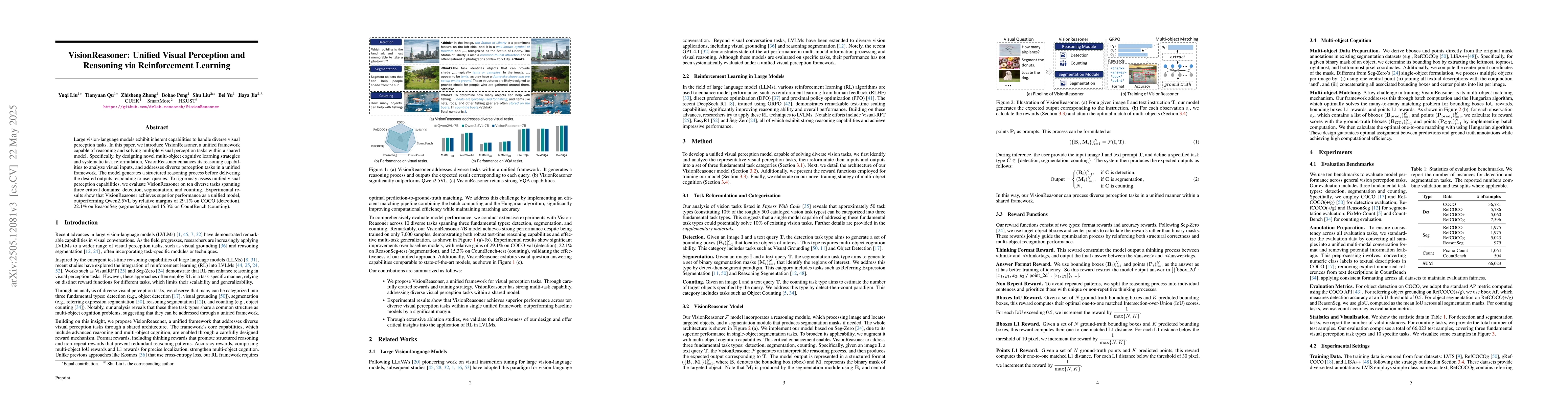 VisionReasoner is a unified framework that enables visual perception tasks like detection, segmentation, and counting using reinforcement learning and structured reasoning. It outperforms existing models on diverse tasks with relative margins of 29.1% to 15.3%.
