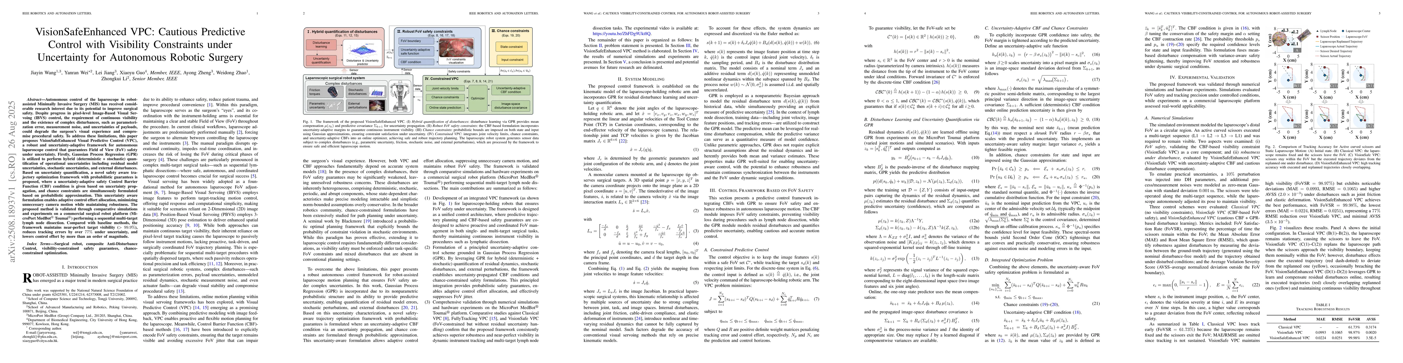 Autonomous control of the laparoscope in robot-assisted Minimally Invasive Surgery (MIS) has received considerable research interest due to its potential to improve surgical safety. Despite progress in pixel-level Image-Based Visual Servoing (IBVS) control, the requirement of continuous visibility and the existence of complex disturbances, such as parameterization error, measurement noise, and uncertainties of payloads, could degrade the surgeon's visual experience and compromise procedural safety. To address these limitations, this paper proposes VisionSafeEnhanced Visual Predictive Control (VPC), a robust and uncertainty-adaptive framework for autonomous laparoscope control that guarantees Field of View (FoV) safety under uncertainty. Firstly, Gaussian Process Regression (GPR) is utilized to perform hybrid (deterministic + stochastic) quantification of operational uncertainties including residual model uncertainties, stochastic uncertainties, and external disturbances. Based on uncertainty quantification, a novel safety aware trajectory optimization framework with probabilistic guarantees is proposed, where a uncertainty-adaptive safety Control Barrier Function (CBF) condition is given based on uncertainty propagation, and chance constraints are simultaneously formulated based on probabilistic approximation. This uncertainty aware formulation enables adaptive control effort allocation, minimizing unnecessary camera motion while maintaining robustness. The proposed method is validated through comparative simulations and experiments on a commercial surgical robot platform (MicroPort MedBot Toumai) performing a sequential multi-target lymph node dissection. Compared with baseline methods, the framework maintains near-perfect target visibility (>99.9%), reduces tracking e