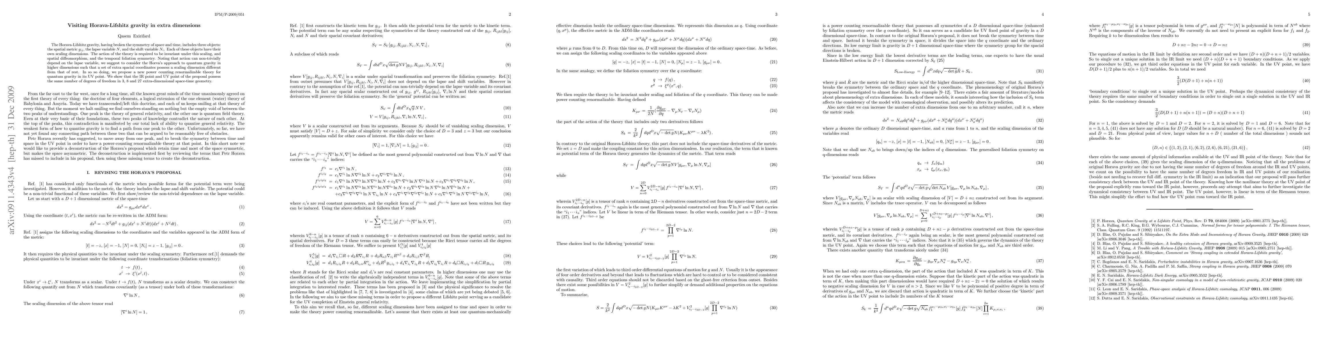 The Horava-Lifshitz gravity, having broken the symmetry of space and time, includes three objects: the spatial metric $g_{ij}$, the lapse variable $N$, and the shift variable $N_{i}$. Each of these objects have their own scaling dimensions. The action of the theory is required to be invariant under this scaling, and spatial diffeomorphism, and the temporal foliation symmetry. Noting that action can non-trivially depend on the lapse variable, we suggest to consider the Horva's approach to quantum gravity in higher dimensions such that a set of extra spacial coordinates possess a scaling dimension different from that of rest. In so so doing, we propose a new power counting renormalizable theory for quantum gravity in its UV point. We show that the IR point and UV point of the proposal possess the same number of degrees of freedom in 3, 8 and 27 extra-dimensional space-time geometry.
