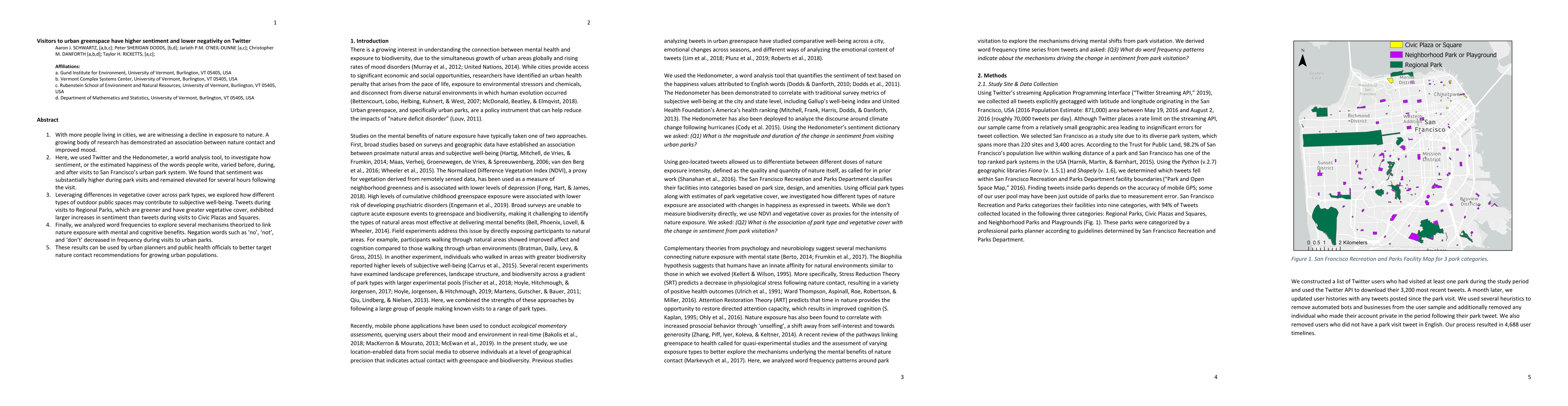 With more people living in cities, we are witnessing a decline in exposure to nature. A growing body of research has demonstrated an association between nature contact and improved mood. Here, we used Twitter and the Hedonometer, a world analysis tool, to investigate how sentiment, or the estimated happiness of the words people write, varied before, during, and after visits to San Francisco's urban park system. We found that sentiment was substantially higher during park visits and remained elevated for several hours following the visit. Leveraging differences in vegetative cover across park types, we explored how different types of outdoor public spaces may contribute to subjective well-being. Tweets during visits to Regional Parks, which are greener and have greater vegetative cover, exhibited larger increases in sentiment than tweets during visits to Civic Plazas and Squares. Finally, we analyzed word frequencies to explore several mechanisms theorized to link nature exposure with mental and cognitive benefits. Negation words such as 'no', 'not', and 'don't' decreased in frequency during visits to urban parks. These results can be used by urban planners and public health officials to better target nature contact recommendations for growing urban populations.