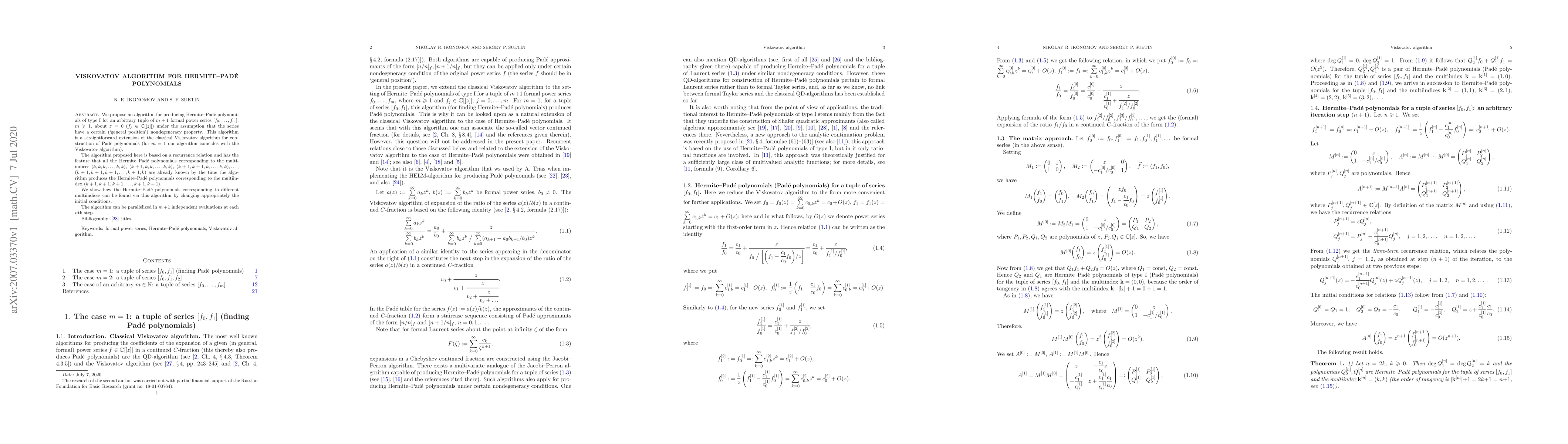 This paper proposes an extension of the Viskovatov algorithm to construct Hermite-Padé polynomials for a tuple of formal power series, utilizing a recurrence relation. The algorithm efficiently produces polynomials by pre-calculating specific forms, allowing for parallel computation.