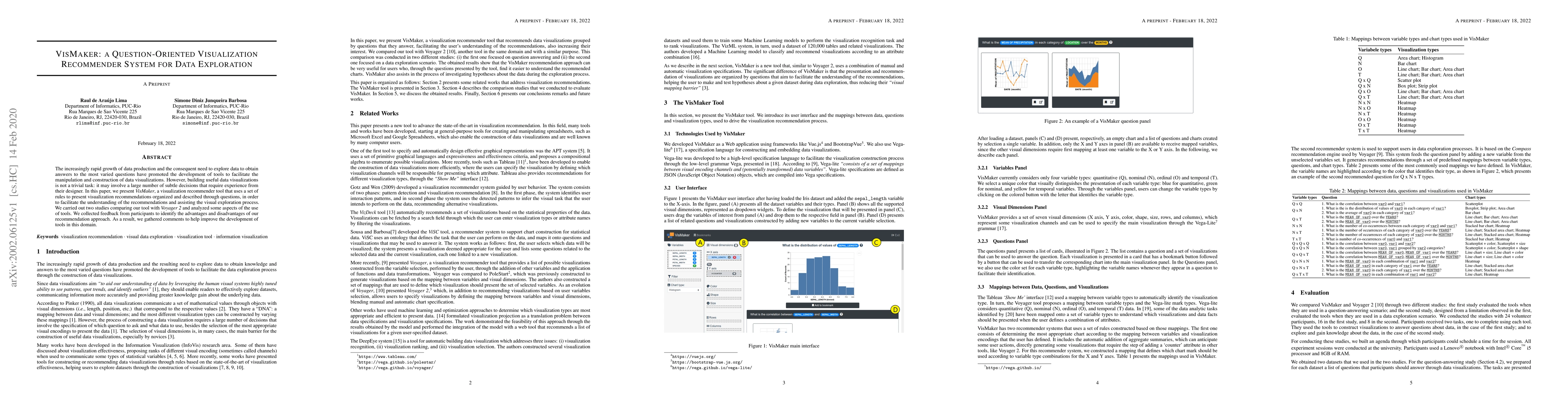 VisMaker is a visualization recommender system that helps users create useful data visualizations through a set of rules-based recommendations organized around questions. It aims to facilitate the exploration process and improve the development of tools in data visualization.