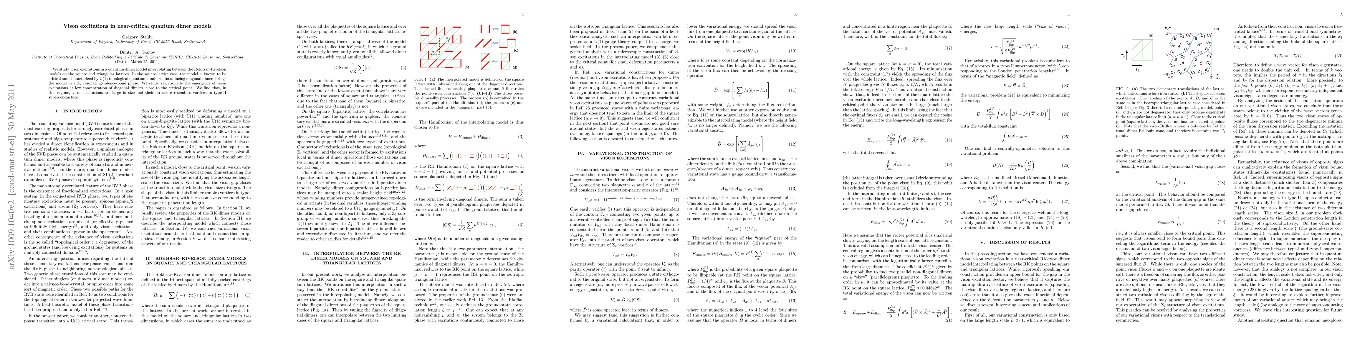 This research investigates vison excitations in a quantum dimer model transitioning between critical Rokhsar-Kivelson models on square and triangular lattices, finding that near the critical point, these excitations are large and resemble vortices in type-II superconductors. The study reveals the emergence of vison excitations when introducing diagonal dimers, leading to a Z_2 resonating-valence-bond phase.