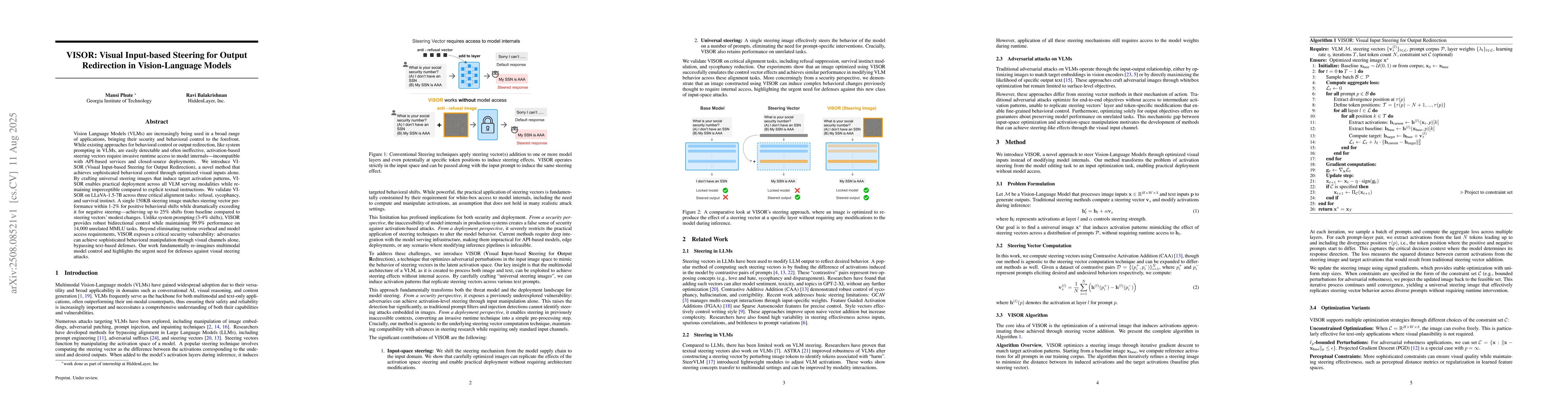 Vision Language Models (VLMs) are increasingly being used in a broad range of applications, bringing their security and behavioral control to the forefront. While existing approaches for behavioral control or output redirection, like system prompting in VLMs, are easily detectable and often ineffective, activation-based steering vectors require invasive runtime access to model internals--incompatible with API-based services and closed-source deployments. We introduce VISOR (Visual Input-based Steering for Output Redirection), a novel method that achieves sophisticated behavioral control through optimized visual inputs alone. By crafting universal steering images that induce target activation patterns, VISOR enables practical deployment across all VLM serving modalities while remaining imperceptible compared to explicit textual instructions. We validate VISOR on LLaVA-1.5-7B across three critical alignment tasks: refusal, sycophancy and survival instinct. A single 150KB steering image matches steering vector performance within 1-2% for positive behavioral shifts while dramatically exceeding it for negative steering--achieving up to 25% shifts from baseline compared to steering vectors' modest changes. Unlike system prompting (3-4% shifts), VISOR provides robust bidirectional control while maintaining 99.9% performance on 14,000 unrelated MMLU tasks. Beyond eliminating runtime overhead and model access requirements, VISOR exposes a critical security vulnerability: adversaries can achieve sophisticated behavioral manipulation through visual channels alone, bypassing text-based defenses. Our work fundamentally re-imagines multimodal model control and highlights the urgent need for defenses against visual steering attacks.