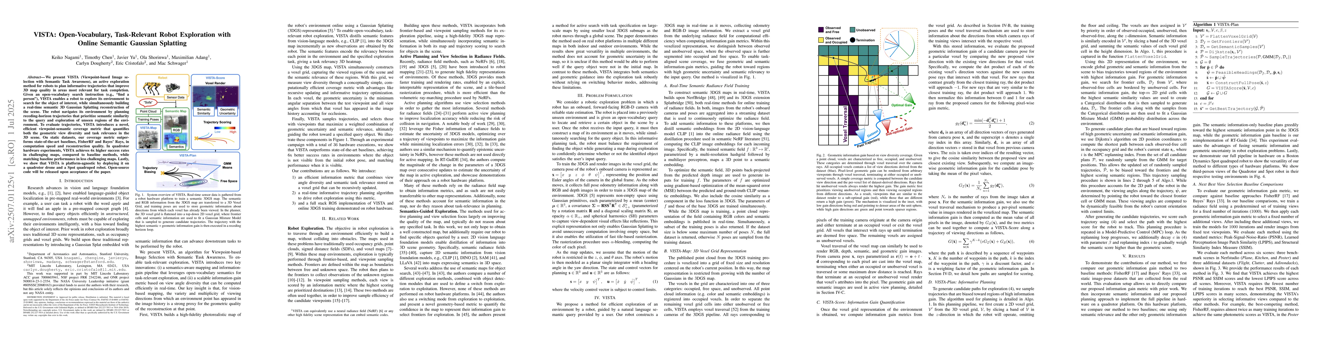We present VISTA (Viewpoint-based Image selection with Semantic Task Awareness), an active exploration method for robots to plan informative trajectories that improve 3D map quality in areas most relevant for task completion. Given an open-vocabulary search instruction (e.g., "find a person"), VISTA enables a robot to explore its environment to search for the object of interest, while simultaneously building a real-time semantic 3D Gaussian Splatting reconstruction of the scene. The robot navigates its environment by planning receding-horizon trajectories that prioritize semantic similarity to the query and exploration of unseen regions of the environment. To evaluate trajectories, VISTA introduces a novel, efficient viewpoint-semantic coverage metric that quantifies both the geometric view diversity and task relevance in the 3D scene. On static datasets, our coverage metric outperforms state-of-the-art baselines, FisherRF and Bayes' Rays, in computation speed and reconstruction quality. In quadrotor hardware experiments, VISTA achieves 6x higher success rates in challenging maps, compared to baseline methods, while matching baseline performance in less challenging maps. Lastly, we show that VISTA is platform-agnostic by deploying it on a quadrotor drone and a Spot quadruped robot. Open-source code will be released upon acceptance of the paper.