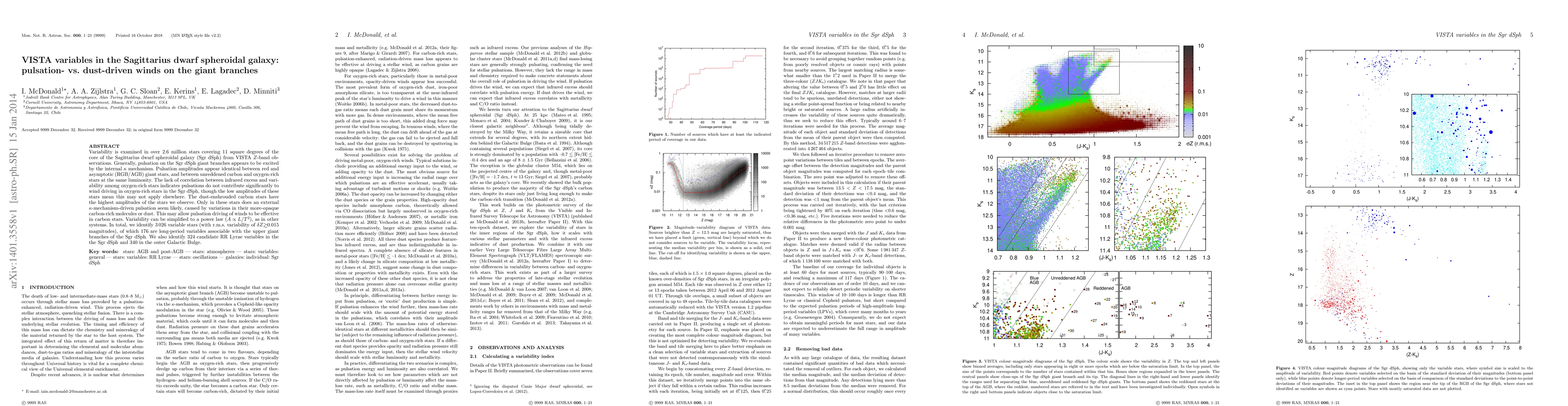 Variability is examined in over 2.6 million stars covering 11 square degrees of the core of the Sagittarius dwarf spheroidal galaxy (Sgr dSph) from VISTA Z-band observations. Generally, pulsation on the Sgr dSph giant branches appears to be excited by the internal kappa mechanism. Pulsation amplitudes appear identical between red and asymptotic (RGB/AGB) giant stars, and between unreddened carbon and oxygen-rich stars at the same luminosity. The lack of correlation between infrared excess and variability among oxygen-rich stars indicates pulsations do not contribute significantly to wind driving in oxygen-rich stars in the Sgr dSph, though the low amplitudes of these stars mean this may not apply elsewhere. The dust-enshrouded carbon stars have the highest amplitudes of the stars we observe. Only in these stars does an external kappa-mechanism-driven pulsation seem likely, caused by variations in their more-opaque carbon-rich molecules or dust. This may allow pulsation driving of winds to be effective in carbon stars. Variability can be simplified to a power law (amplitude proportional to L/T^2), as in other systems. In total, we identify 3026 variable stars (with r.m.s. variability of delta Z >~ 0.015 magnitudes), of which 176 are long-period variables associable with the upper giant branches of the Sgr dSph. We also identify 324 candidate RR Lyrae variables in the the Sgr dSph and 340 in the outer Galactic Bulge.
