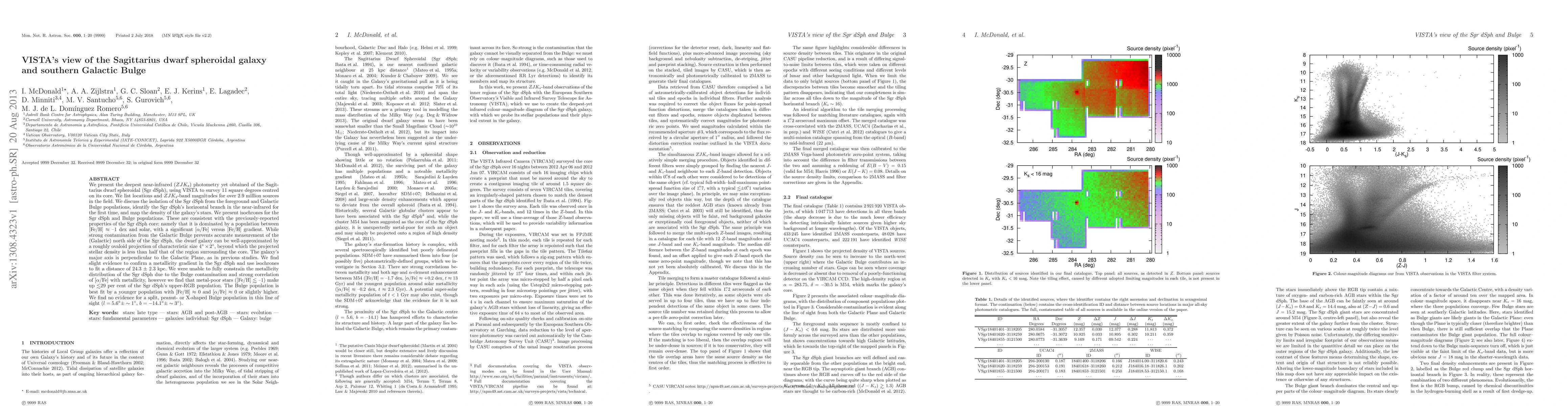 The VISTA survey provides the deepest near-infrared photometry of the Sagittarius dwarf spheroidal galaxy, identifying over 2.9 million stars and revealing a significant [alpha/Fe] versus [Fe/H] gradient. The study finds a distance of 24.3 +/- 2.3 kpc and slight evidence for a metallicity gradient in the Sgr dSph, though contamination from the Galactic Bulge complicates precise measurements.
