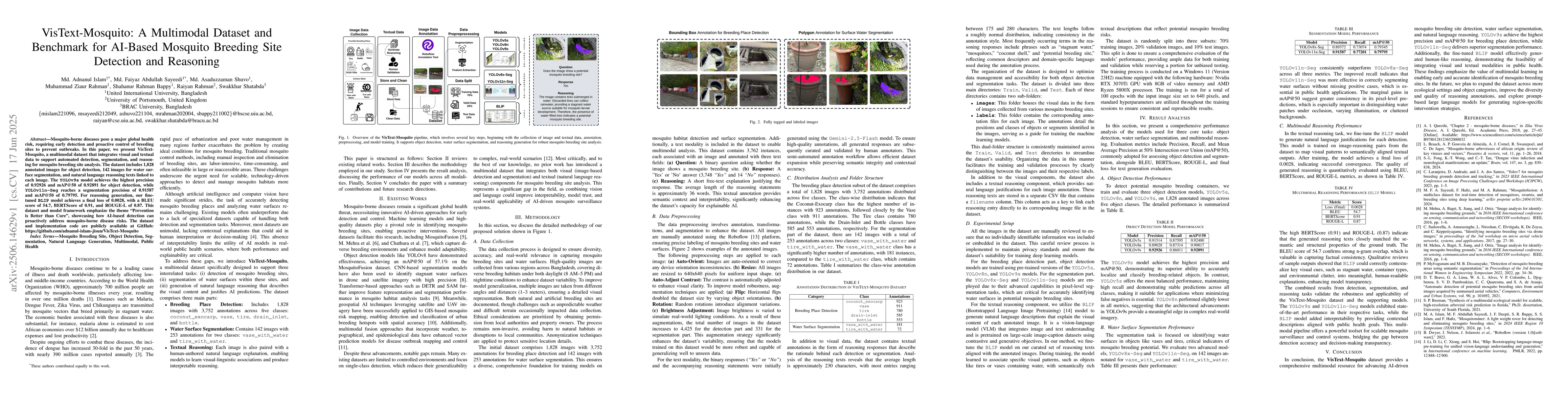 Mosquito-borne diseases pose a major global health risk, requiring early detection and proactive control of breeding sites to prevent outbreaks. In this paper, we present VisText-Mosquito, a multimodal dataset that integrates visual and textual data to support automated detection, segmentation, and reasoning for mosquito breeding site analysis. The dataset includes 1,828 annotated images for object detection, 142 images for water surface segmentation, and natural language reasoning texts linked to each image. The YOLOv9s model achieves the highest precision of 0.92926 and mAP@50 of 0.92891 for object detection, while YOLOv11n-Seg reaches a segmentation precision of 0.91587 and mAP@50 of 0.79795. For reasoning generation, our fine-tuned BLIP model achieves a final loss of 0.0028, with a BLEU score of 54.7, BERTScore of 0.91, and ROUGE-L of 0.87. This dataset and model framework emphasize the theme "Prevention is Better than Cure", showcasing how AI-based detection can proactively address mosquito-borne disease risks. The dataset and implementation code are publicly available at GitHub: https://github.com/adnanul-islam-jisun/VisText-Mosquito