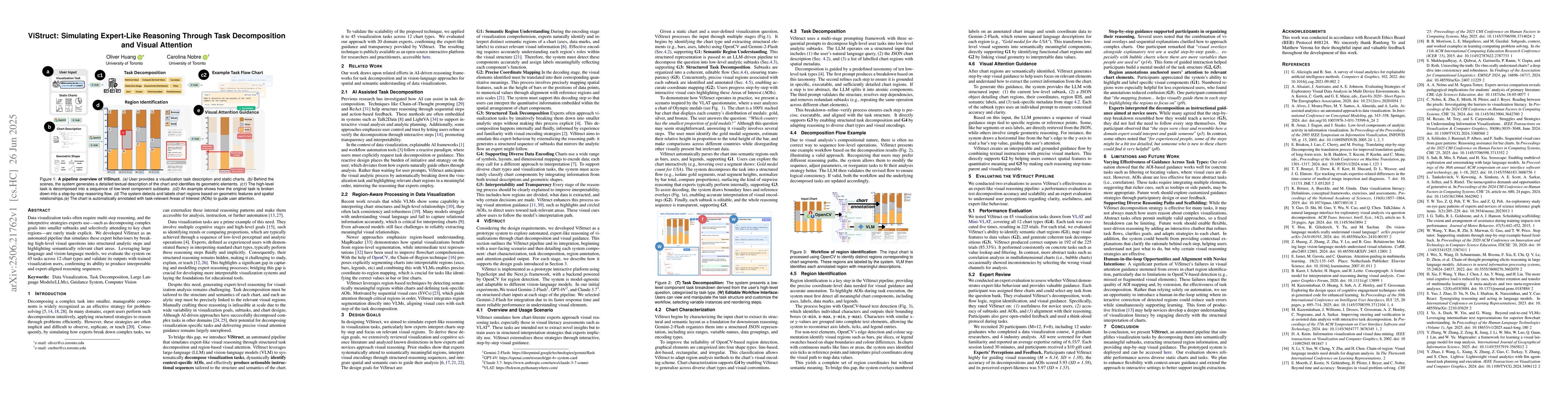 Data visualization tasks often require multi-step reasoning, and the interpretive strategies experts use, such as decomposing complex goals into smaller subtasks and selectively attending to key chart regions are rarely made explicit. ViStruct is an automated pipeline that simulates these expert behaviours by breaking high-level visual questions into structured analytic steps and highlighting semantically relevant chart areas. Leveraging large language and vision-language models, ViStruct identifies chart components, maps subtasks to spatial regions, and presents visual attention cues to externalize expert-like reasoning flows. While not designed for direct novice instruction, ViStruct provides a replicable model of expert interpretation that can inform the development of future visual literacy tools. We evaluate the system on 45 tasks across 12 chart types and validate its outputs with trained visualization users, confirming its ability to produce interpretable and expert-aligned reasoning sequences.