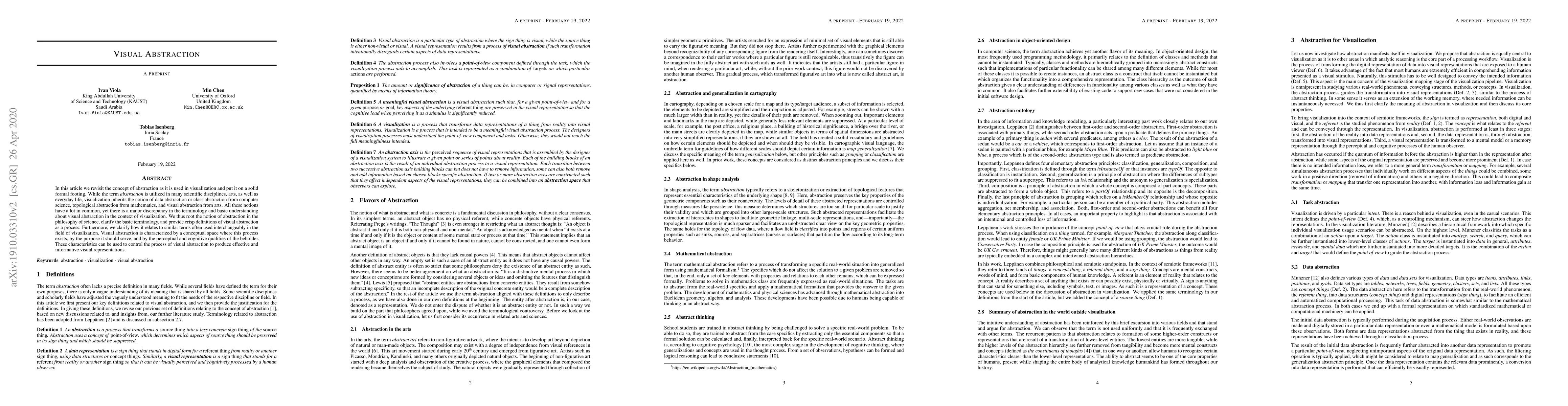 This paper formalizes the concept of visual abstraction in visualization, clarifying its terminology and defining its purpose and cognitive qualities. It aims to control the process to create effective visual representations by understanding its philosophical roots and distinguishing it from similar concepts.