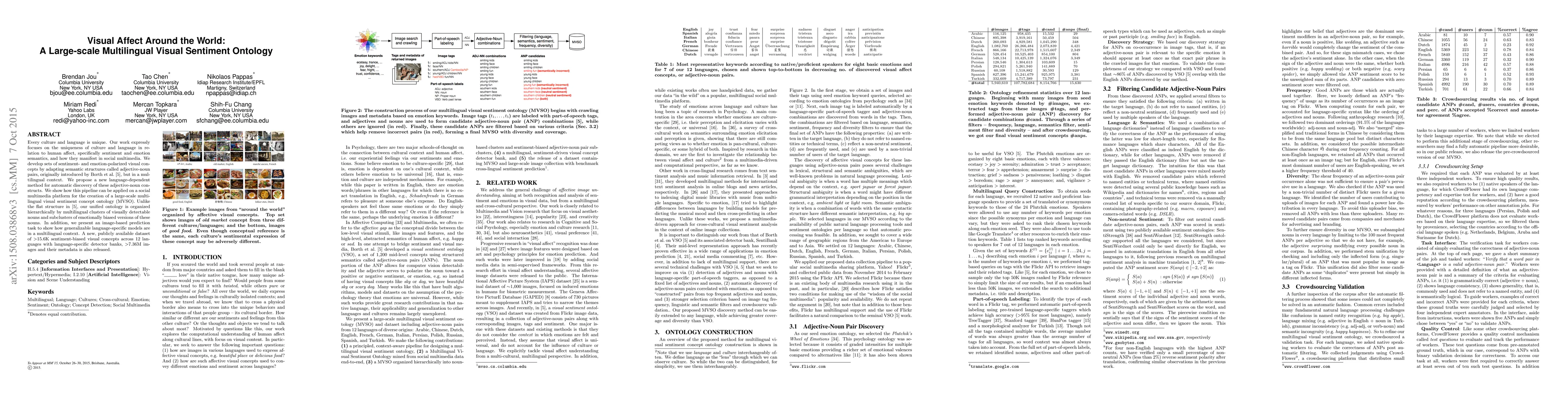 Every culture and language is unique. Our work expressly focuses on the uniqueness of culture and language in relation to human affect, specifically sentiment and emotion semantics, and how they manifest in social multimedia. We develop sets of sentiment- and emotion-polarized visual concepts by adapting semantic structures called adjective-noun pairs, originally introduced by Borth et al. (2013), but in a multilingual context. We propose a new language-dependent method for automatic discovery of these adjective-noun constructs. We show how this pipeline can be applied on a social multimedia platform for the creation of a large-scale multilingual visual sentiment concept ontology (MVSO). Unlike the flat structure in Borth et al. (2013), our unified ontology is organized hierarchically by multilingual clusters of visually detectable nouns and subclusters of emotionally biased versions of these nouns. In addition, we present an image-based prediction task to show how generalizable language-specific models are in a multilingual context. A new, publicly available dataset of >15.6K sentiment-biased visual concepts across 12 languages with language-specific detector banks, >7.36M images and their metadata is also released.