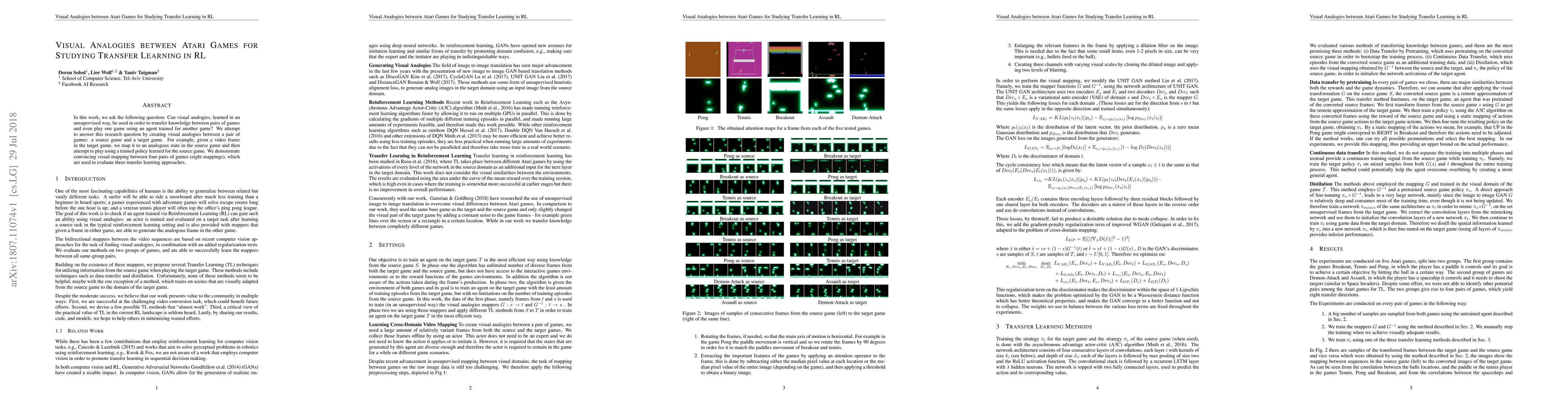 This paper explores the use of unsupervised visual analogies between Atari games to facilitate transfer learning in reinforcement learning. It demonstrates successful visual mapping between pairs of games and evaluates three transfer learning methods to play one game using an agent trained for another.