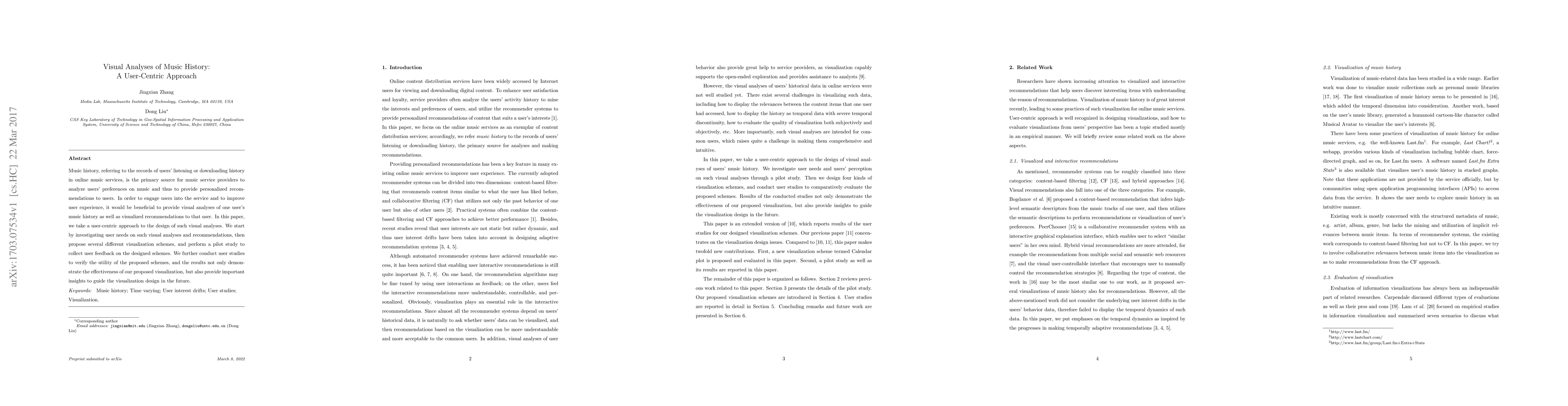 Music history, referring to the records of users' listening or downloading history in online music services, is the primary source for music service providers to analyze users' preferences on music and thus to provide personalized recommendations to users. In order to engage users into the service and to improve user experience, it would be beneficial to provide visual analyses of one user's music history as well as visualized recommendations to that user. In this paper, we take a user-centric approach to the design of such visual analyses. We start by investigating user needs on such visual analyses and recommendations, then propose several different visualization schemes, and perform a pilot study to collect user feedback on the designed schemes. We further conduct user studies to verify the utility of the proposed schemes, and the results not only demonstrate the effectiveness of our proposed visualization, but also provide important insights to guide the visualization design in the future.