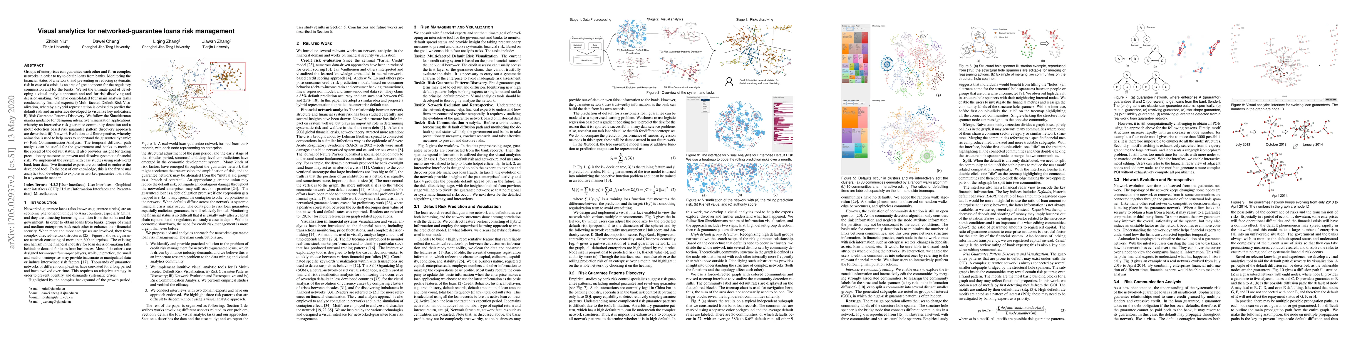 This paper proposes a visual analytics approach to manage risks within networked-guarantee loan systems. It consolidates five analysis tasks, including default risk visualization, high-default group detection, and evolving network dynamics, using a hybrid representation and community detection techniques. The implemented system aids financial experts in monitoring and mitigating systemic risks, with endorsements from two financial experts.