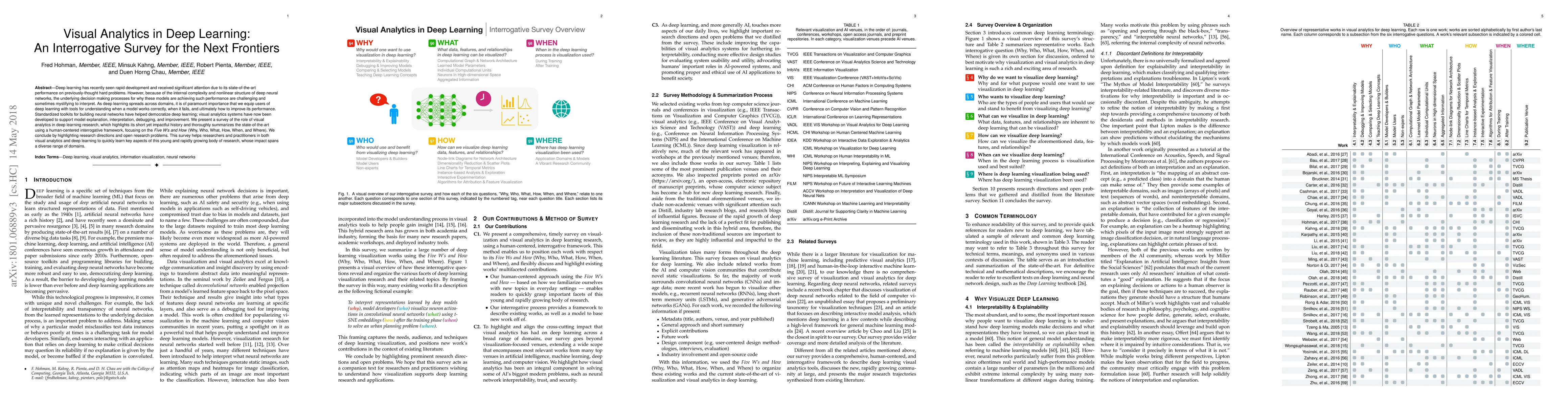 Deep learning has recently seen rapid development and received significant attention due to its state-of-the-art performance on previously-thought hard problems. However, because of the internal complexity and nonlinear structure of deep neural networks, the underlying decision making processes for why these models are achieving such performance are challenging and sometimes mystifying to interpret. As deep learning spreads across domains, it is of paramount importance that we equip users of deep learning with tools for understanding when a model works correctly, when it fails, and ultimately how to improve its performance. Standardized toolkits for building neural networks have helped democratize deep learning; visual analytics systems have now been developed to support model explanation, interpretation, debugging, and improvement. We present a survey of the role of visual analytics in deep learning research, which highlights its short yet impactful history and thoroughly summarizes the state-of-the-art using a human-centered interrogative framework, focusing on the Five W's and How (Why, Who, What, How, When, and Where). We conclude by highlighting research directions and open research problems. This survey helps researchers and practitioners in both visual analytics and deep learning to quickly learn key aspects of this young and rapidly growing body of research, whose impact spans a diverse range of domains.