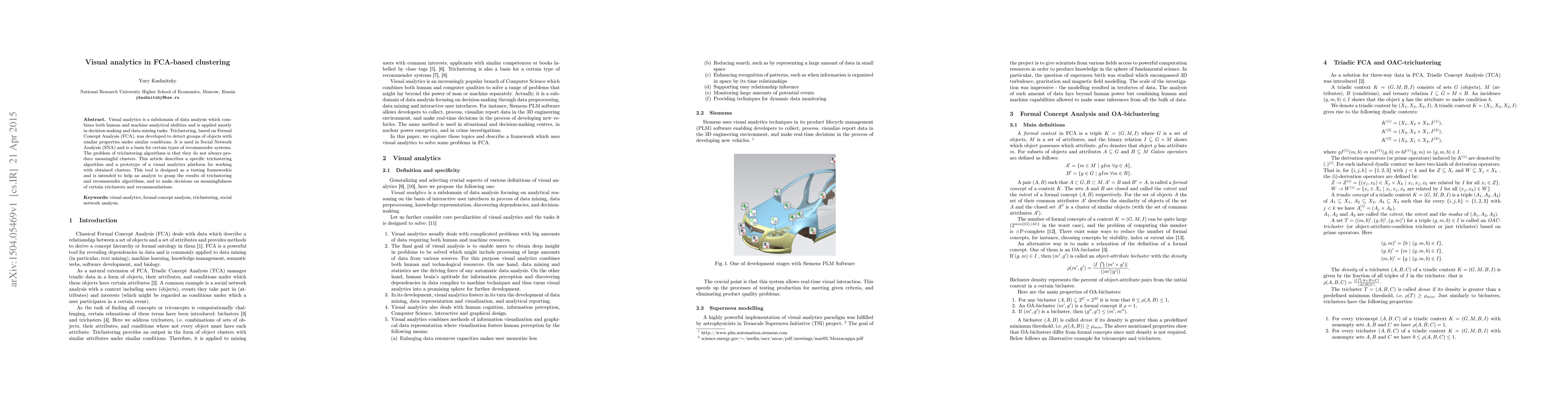 Visual analytics is a subdomain of data analysis which combines both human and machine analytical abilities and is applied mostly in decision-making and data mining tasks. Triclustering, based on Formal Concept Analysis (FCA), was developed to detect groups of objects with similar properties under similar conditions. It is used in Social Network Analysis (SNA) and is a basis for certain types of recommender systems. The problem of triclustering algorithms is that they do not always produce meaningful clusters. This article describes a specific triclustering algorithm and a prototype of a visual analytics platform for working with obtained clusters. This tool is designed as a testing frameworkis and is intended to help an analyst to grasp the results of triclustering and recommender algorithms, and to make decisions on meaningfulness of certain triclusters and recommendations.