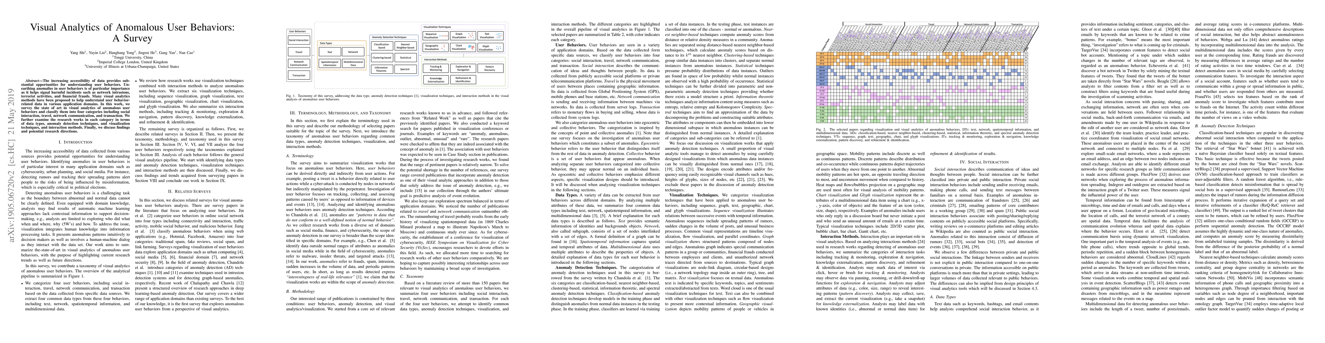 This paper surveys advanced visual analytics methods for detecting anomalous user behaviors across social interaction, travel, network communication, and transaction domains. It categorizes and analyzes existing techniques based on data types, detection methods, visualization approaches, and interaction mechanisms, concluding with insights and future research directions.