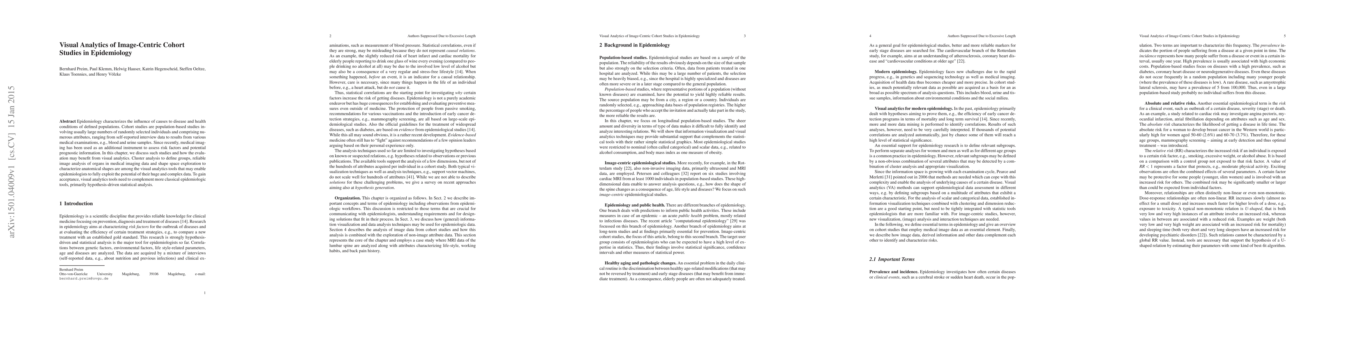 Epidemiology characterizes the influence of causes to disease and health conditions of defined populations. Cohort studies are population-based studies involving usually large numbers of randomly selected individuals and comprising numerous attributes, ranging from self-reported interview data to results from various medical examinations, e.g., blood and urine samples. Since recently, medical imaging has been used as an additional instrument to assess risk factors and potential prognostic information. In this chapter, we discuss such studies and how the evaluation may benefit from visual analytics. Cluster analysis to define groups, reliable image analysis of organs in medical imaging data and shape space exploration to characterize anatomical shapes are among the visual analytics tools that may enable epidemiologists to fully exploit the potential of their huge and complex data. To gain acceptance, visual analytics tools need to complement more classical epidemiologic tools, primarily hypothesis-driven statistical analysis.