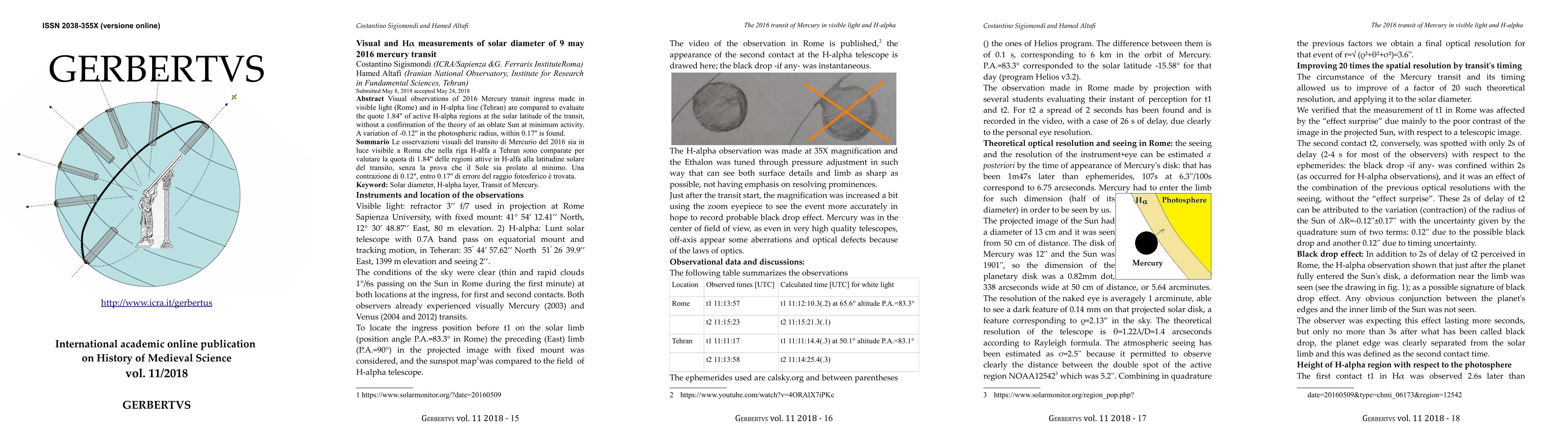 Visual observations of 2016 Mercury transit ingress made in visible light (Rome) and in H-alpha line (Tehran) are compared to evaluate the quote 1.84" of active H-alpha regions at the solar latitude of the transit, without a confirmation of the theory of an oblate Sun at minimum activity. A variation of -0.12" in the photospheric radius, within 0.17" is found.