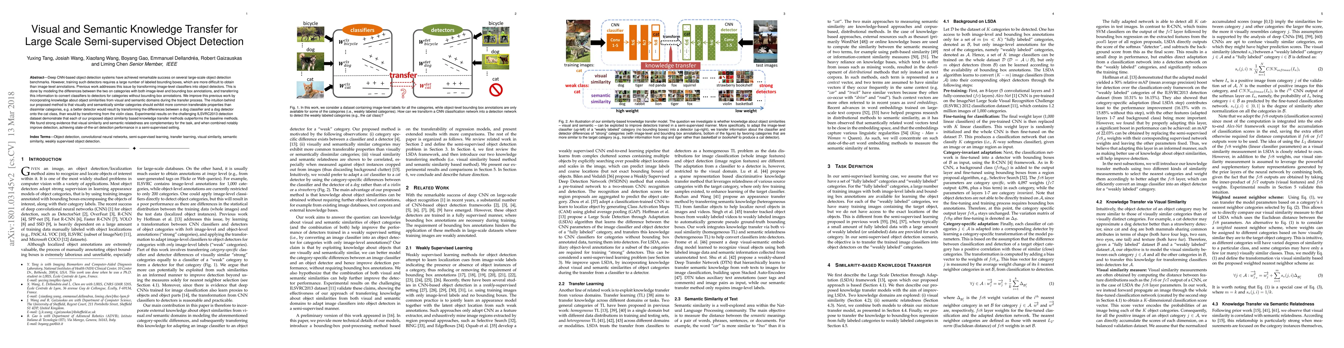 This paper proposes a method to enhance large-scale semi-supervised object detection using visual and semantic knowledge transfer, showing that incorporating object similarities leads to better detectors than traditional methods. Experiments on the ILSVRC2013 dataset demonstrate superior performance, indicating that visual and semantic similarities complement each other to achieve state-of-the-art results.