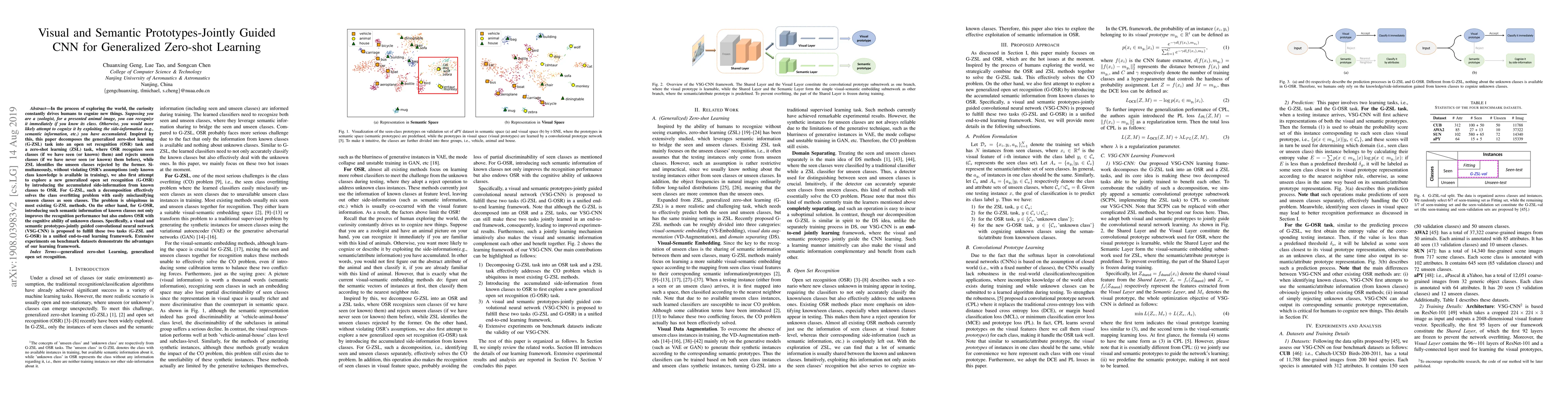 In the process of exploring the world, the curiosity constantly drives humans to cognize new things. Supposing you are a zoologist, for a presented animal image, you can recognize it immediately if you know its class. Otherwise, you would more likely attempt to cognize it by exploiting the side-information (e.g., semantic information, etc.) you have accumulated. Inspired by this, this paper decomposes the generalized zero-shot learning (G-ZSL) task into an open set recognition (OSR) task and a zero-shot learning (ZSL) task, where OSR recognizes seen classes (if we have seen (or known) them) and rejects unseen classes (if we have never seen (or known) them before), while ZSL identifies the unseen classes rejected by the former. Simultaneously, without violating OSR's assumptions (only known class knowledge is available in training), we also first attempt to explore a new generalized open set recognition (G-OSR) by introducing the accumulated side-information from known classes to OSR. For G-ZSL, such a decomposition effectively solves the class overfitting problem with easily misclassifying unseen classes as seen classes. The problem is ubiquitous in most existing G-ZSL methods. On the other hand, for G-OSR, introducing such semantic information of known classes not only improves the recognition performance but also endows OSR with the cognitive ability of unknown classes. Specifically, a visual and semantic prototypes-jointly guided convolutional neural network (VSG-CNN) is proposed to fulfill these two tasks (G-ZSL and G-OSR) in a unified end-to-end learning framework. Extensive experiments on benchmark datasets demonstrate the advantages of our learning framework.