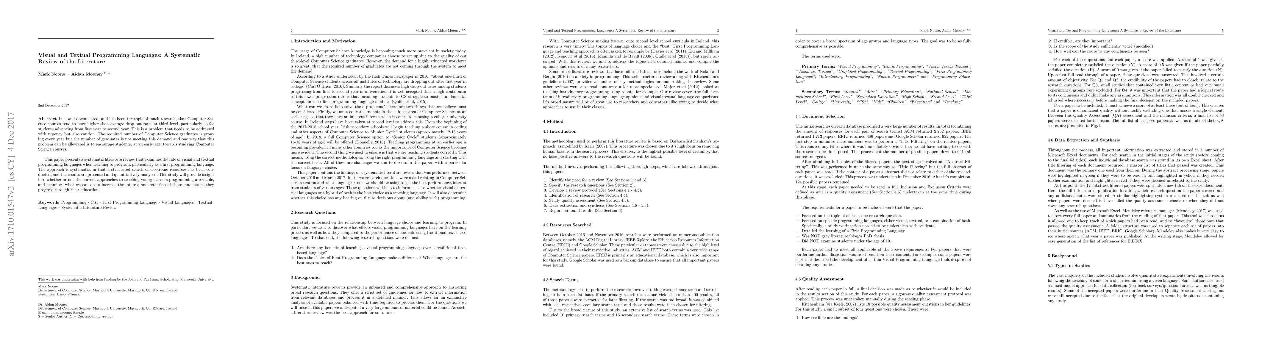 It is well documented, and has been the topic of much research, that Computer Science courses tend to have higher than average drop out rates at third level. This is a problem that needs to be addressed with urgency but also caution. The required number of Computer Science graduates is growing every year but the number of graduates is not meeting this demand and one way that this problem can be alleviated is to encourage students at an early age towards studying Computer Science courses. This paper presents a systematic literature review on the role of visual and textual programming languages when learning to program, particularly as a first programming language. The approach is systematic, in that a structured search of electronic resources has been conducted, and the results are presented and quantitatively analysed. This study will give insight into whether or not the current approaches to teaching young learners programming are viable, and examines what we can do to increase the interest and retention of these students as they progress through their education.