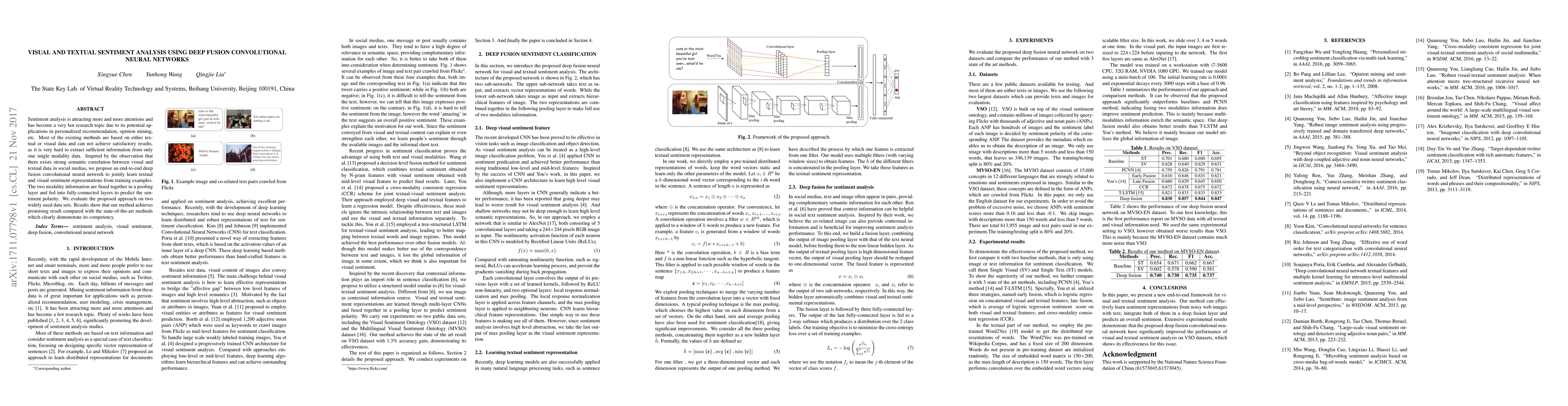 This paper proposes a deep fusion convolutional neural network for sentiment analysis that jointly learns textual and visual representations, achieving better results than existing methods by leveraging the strong semantic correlation between visual and textual data. The approach fuses modality information in a pooling layer and demonstrates promising performance on two datasets.