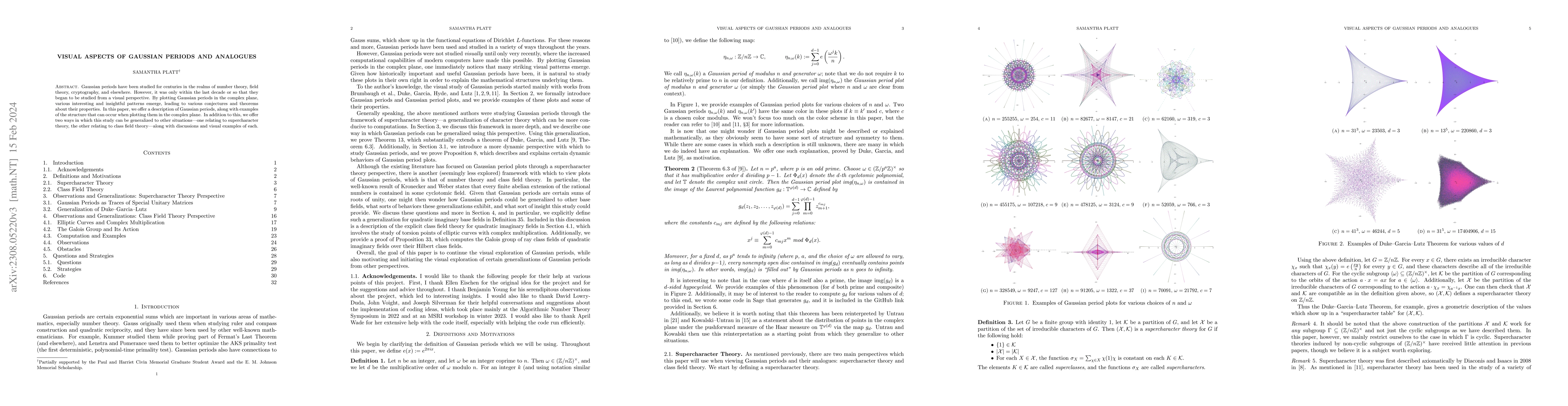 This paper explores Gaussian periods from a visual angle, revealing intricate patterns in the complex plane that lead to new conjectures and theorems. It also generalizes the study to supercharacter theory and class field theory, providing visual examples and code for readers to generate their own images.