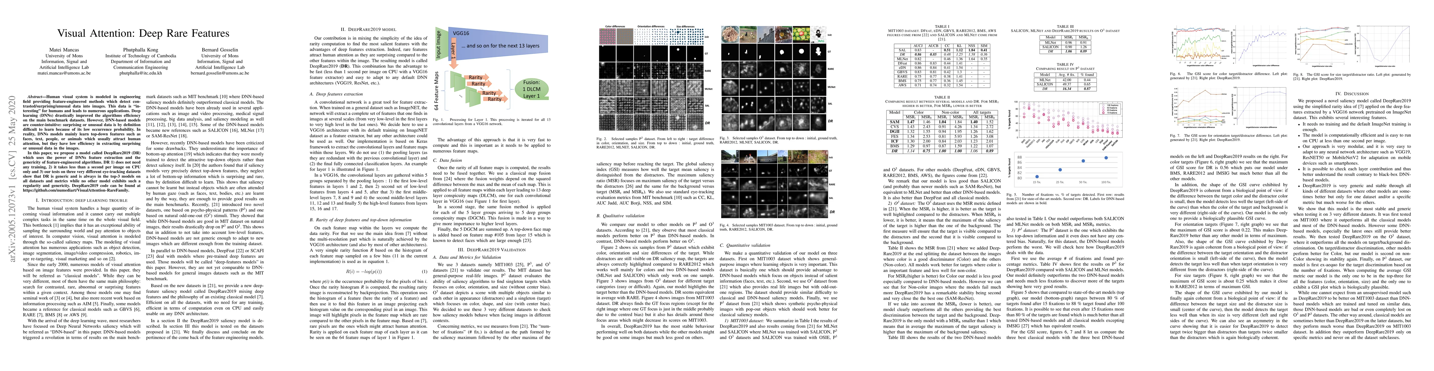 Human visual system is modeled in engineering field providing feature-engineered methods which detect contrasted/surprising/unusual data into images. This data is "interesting" for humans and leads to numerous applications. Deep learning (DNNs) drastically improved the algorithms efficiency on the main benchmark datasets. However, DNN-based models are counter-intuitive: surprising or unusual data is by definition difficult to learn because of its low occurrence probability. In reality, DNNs models mainly learn top-down features such as faces, text, people, or animals which usually attract human attention, but they have low efficiency in extracting surprising or unusual data in the images. In this paper, we propose a model called DeepRare2019 (DR) which uses the power of DNNs feature extraction and the genericity of feature-engineered algorithms. DR 1) does not need any training, 2) it takes less than a second per image on CPU only and 3) our tests on three very different eye-tracking datasets show that DR is generic and is always in the top-3 models on all datasets and metrics while no other model exhibits such a regularity and genericity. DeepRare2019 code can be found at https://github.com/numediart/VisualAttention-RareFamily