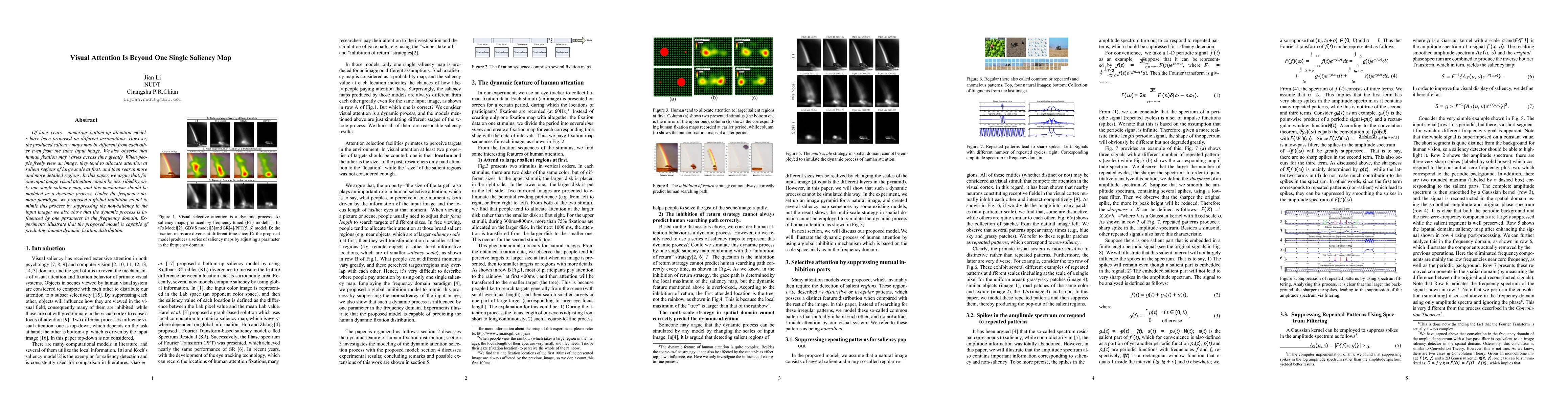 The paper argues that visual attention can't be represented by a single saliency map, proposing a dynamic process model in the frequency domain. It introduces a global inhibition model to suppress non-salient elements and demonstrates that this dynamic attention allocation aligns with human fixation distribution patterns.