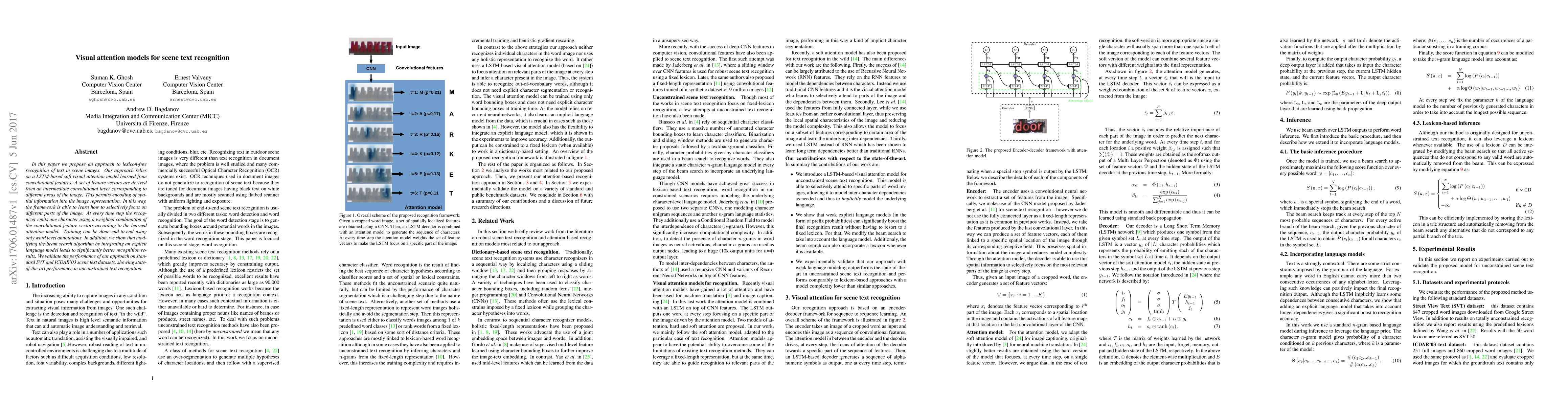 This paper proposes a lexicon-free scene text recognition model using a LSTM-based visual attention mechanism that learns from convolutional features to selectively focus on different image areas. The approach achieves state-of-the-art results on standard datasets by integrating an explicit language model into the modified beam search algorithm.
