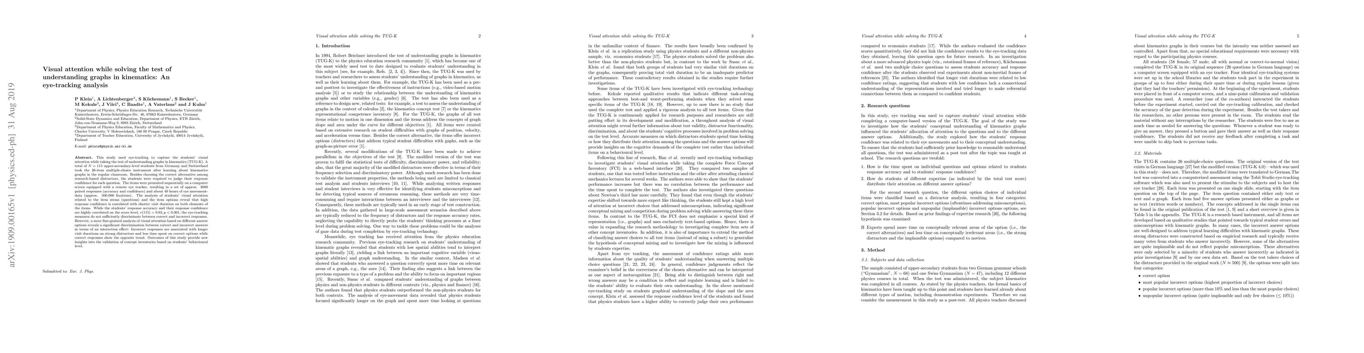 A study using eye-tracking analyzed students' visual attention while solving tests on kinematics graphs, finding that high confidence was linked to shorter visit times but did not reliably distinguish between correct and incorrect answers.