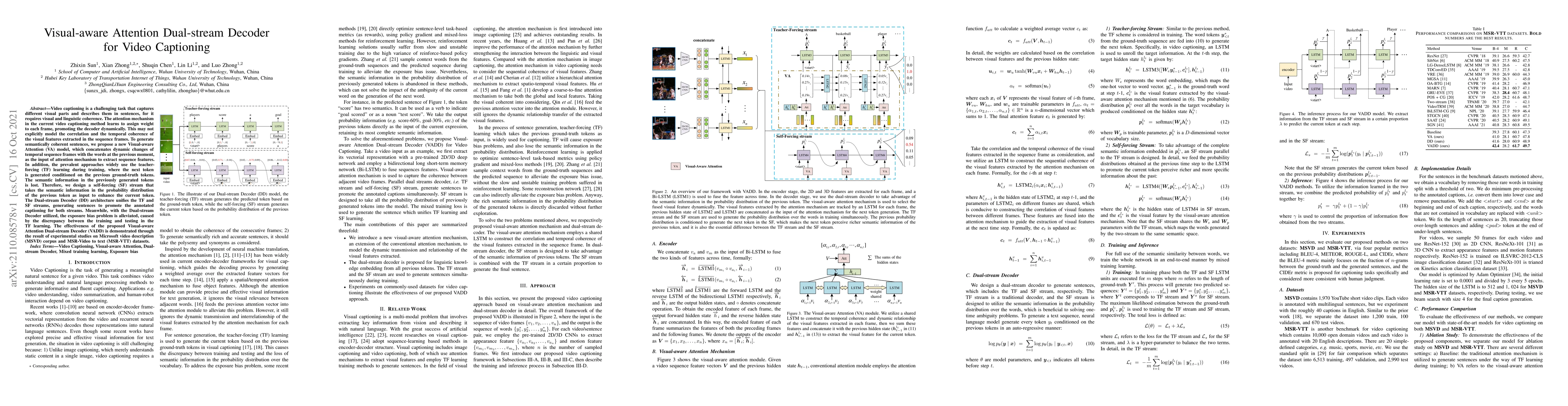 The paper proposes a Visual-aware Attention Dual-stream Decoder (VADD) for video captioning, which integrates a Visual-aware Attention model and a Dual-stream Decoder to enhance visual and linguistic coherence. The method aims to address the exposure bias problem and improve temporal coherence by combining self-forcing and teacher-forcing streams.