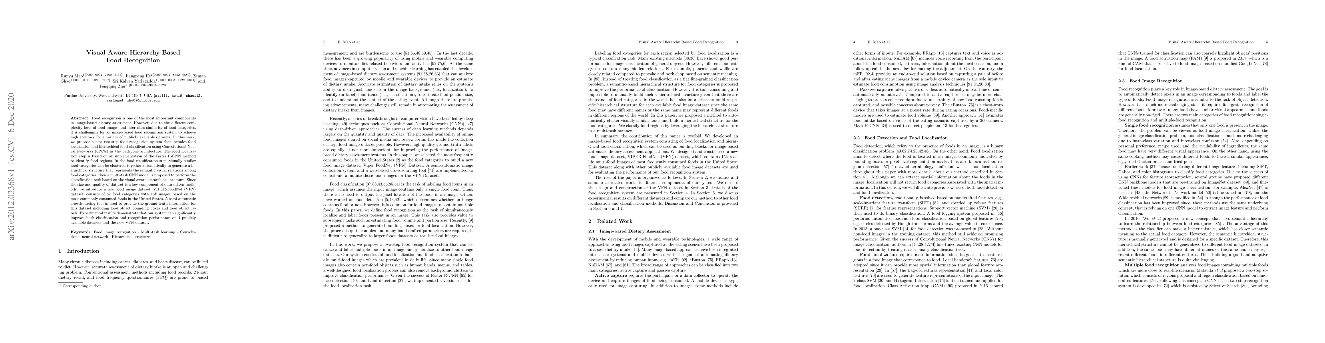 Food recognition is one of the most important components in image-based dietary assessment. However, due to the different complexity level of food images and inter-class similarity of food categories, it is challenging for an image-based food recognition system to achieve high accuracy for a variety of publicly available datasets. In this work, we propose a new two-step food recognition system that includes food localization and hierarchical food classification using Convolutional Neural Networks (CNNs) as the backbone architecture. The food localization step is based on an implementation of the Faster R-CNN method to identify food regions. In the food classification step, visually similar food categories can be clustered together automatically to generate a hierarchical structure that represents the semantic visual relations among food categories, then a multi-task CNN model is proposed to perform the classification task based on the visual aware hierarchical structure. Since the size and quality of dataset is a key component of data driven methods, we introduce a new food image dataset, VIPER-FoodNet (VFN) dataset, consists of 82 food categories with 15k images based on the most commonly consumed foods in the United States. A semi-automatic crowdsourcing tool is used to provide the ground-truth information for this dataset including food object bounding boxes and food object labels. Experimental results demonstrate that our system can significantly improve both classification and recognition performance on 4 publicly available datasets and the new VFN dataset.